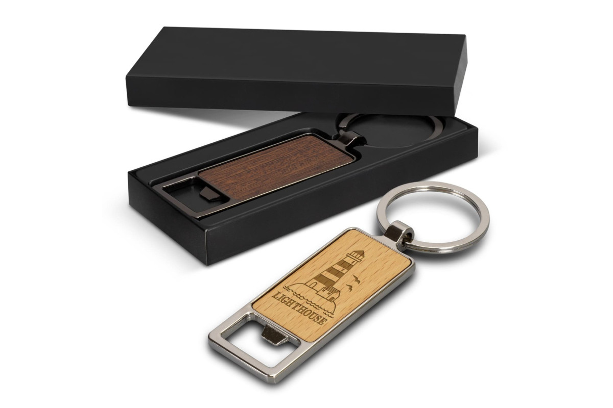 Functional bottle opener keychain has a metal body with a wooden front. It's presented in an individual black box.