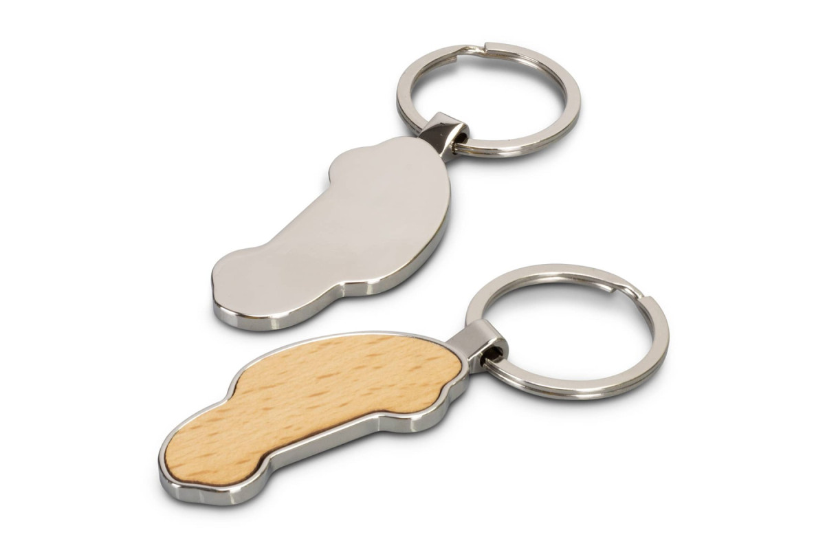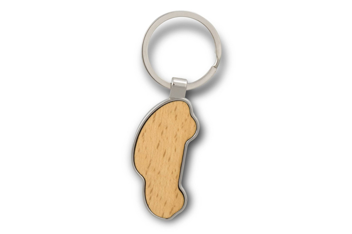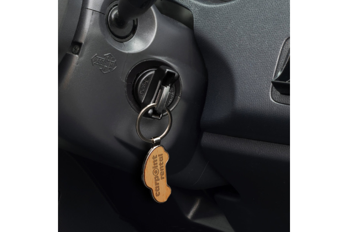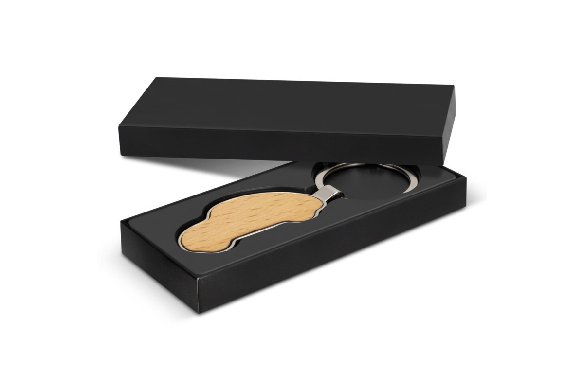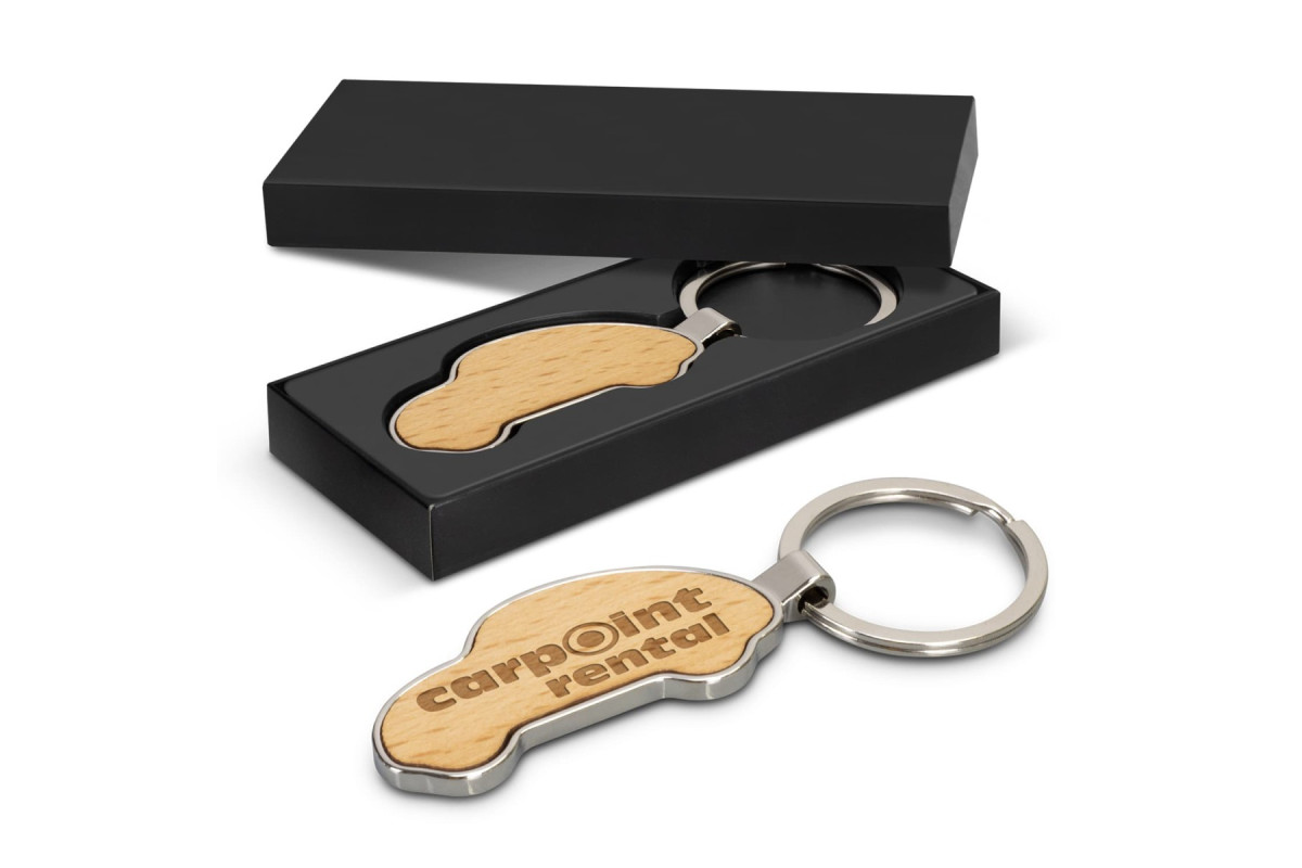 Durable keychain that features a car shaped metal body with a wooden front. It's presented in an individual black box.