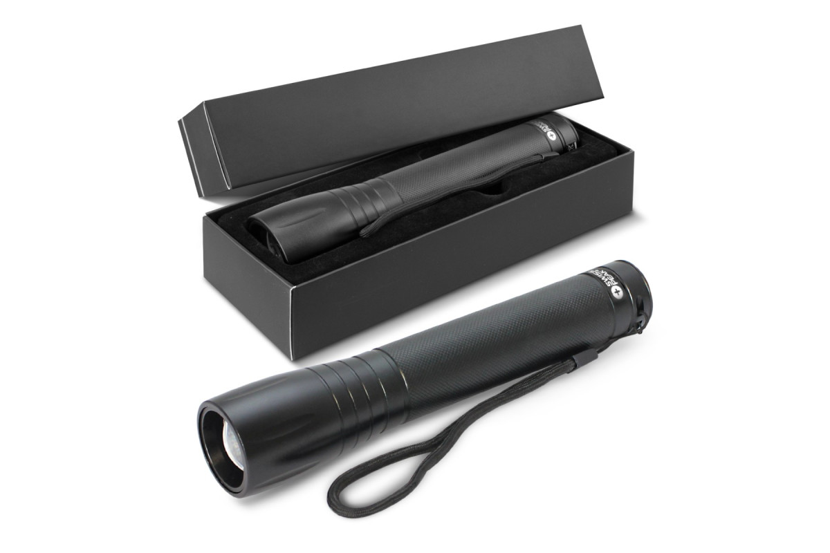 Large 10W metal torch with an adjustable beam which is fitted with Cree brand ultra-bright LEDs. It has a wrist strap and uses three C batteries which are included. The torch laser engraves to an oxidised white colour and it is presented in a printed Swiss Peak gift box.