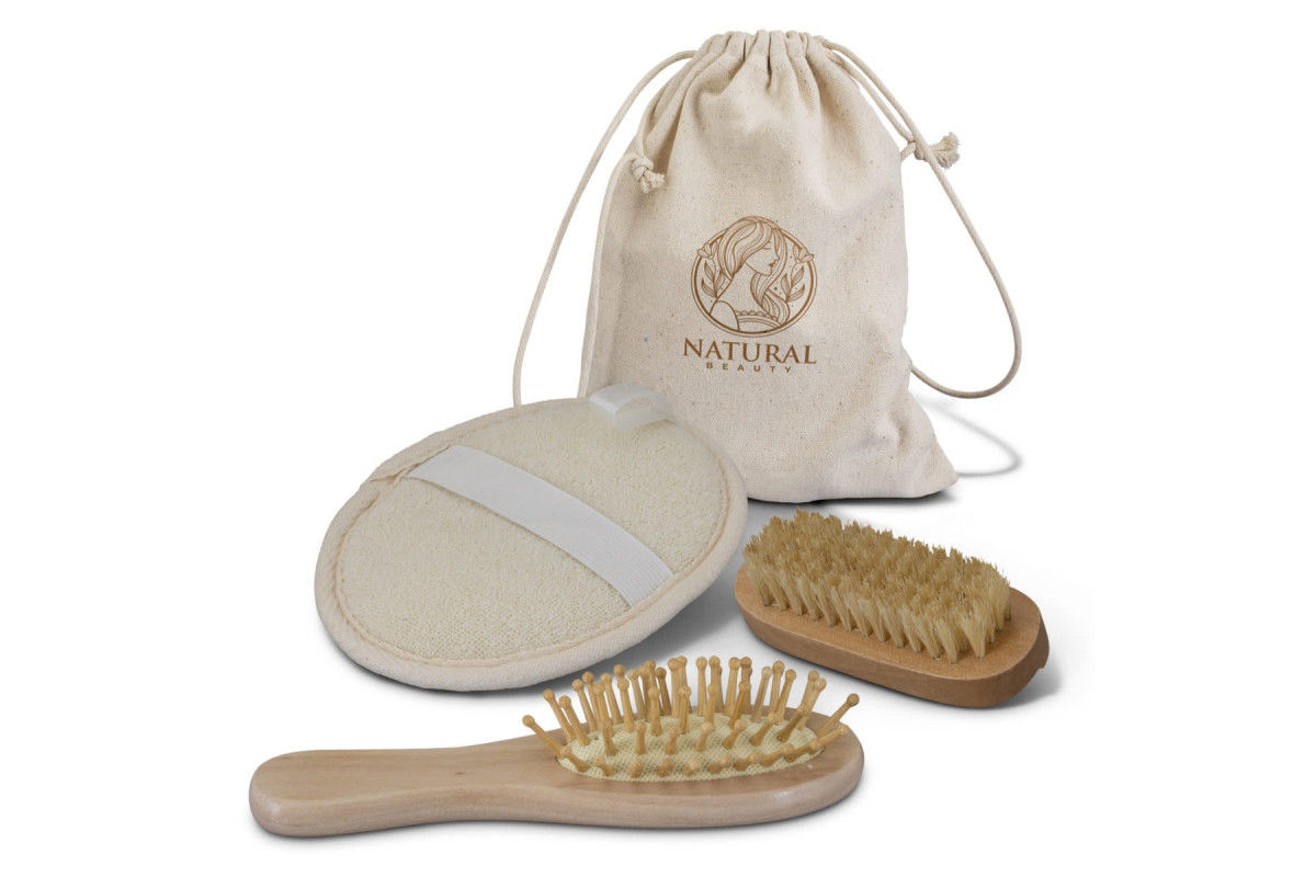 Premium natural bamboo travel set which includes a hairbrush, a nail brush and an exfoliator in a cotton gift bag. Bamboo is a natural material which produces unavoidable variances in the grain pattern colour.