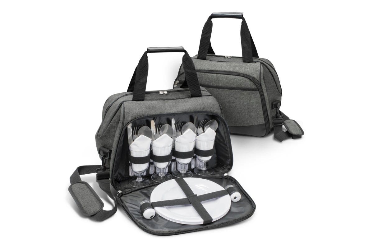 Classically designed four person picnic bag which is manufactured from poly-canvas that has an on-trend, heather style fabric finish. It has a large zippered cooler compartment which is lined with thick PE foam insulation encased in a water-resistant PEVA inner liner. The side compartment has a zip around closure that allows it to open out to 90 degrees revealing plates, cutlery, napkins and glasses for four people as well as salt and pepper shakers. Other features include an external zippered pocket, carry handles with a PU/Velcro wrap and a removable shoulder strap which is adjustable and has a comfortable shoulder pad.