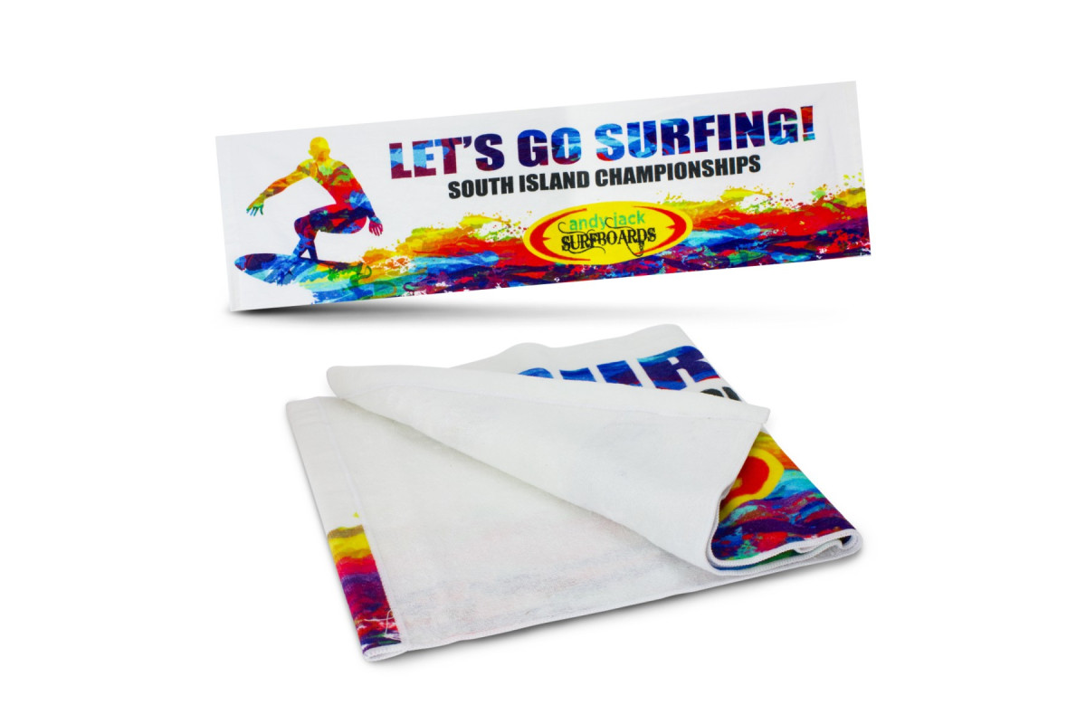 Compact 1100mm x 300mm sports towel that is manufactured from heavy 400gsm cotton. It is branded on one side with stunning high definition digital printing which is colourfast. A production lead time of 30 working days applies to this product by air freight and larger orders can be sea freighted on request to reduce the freight cost.