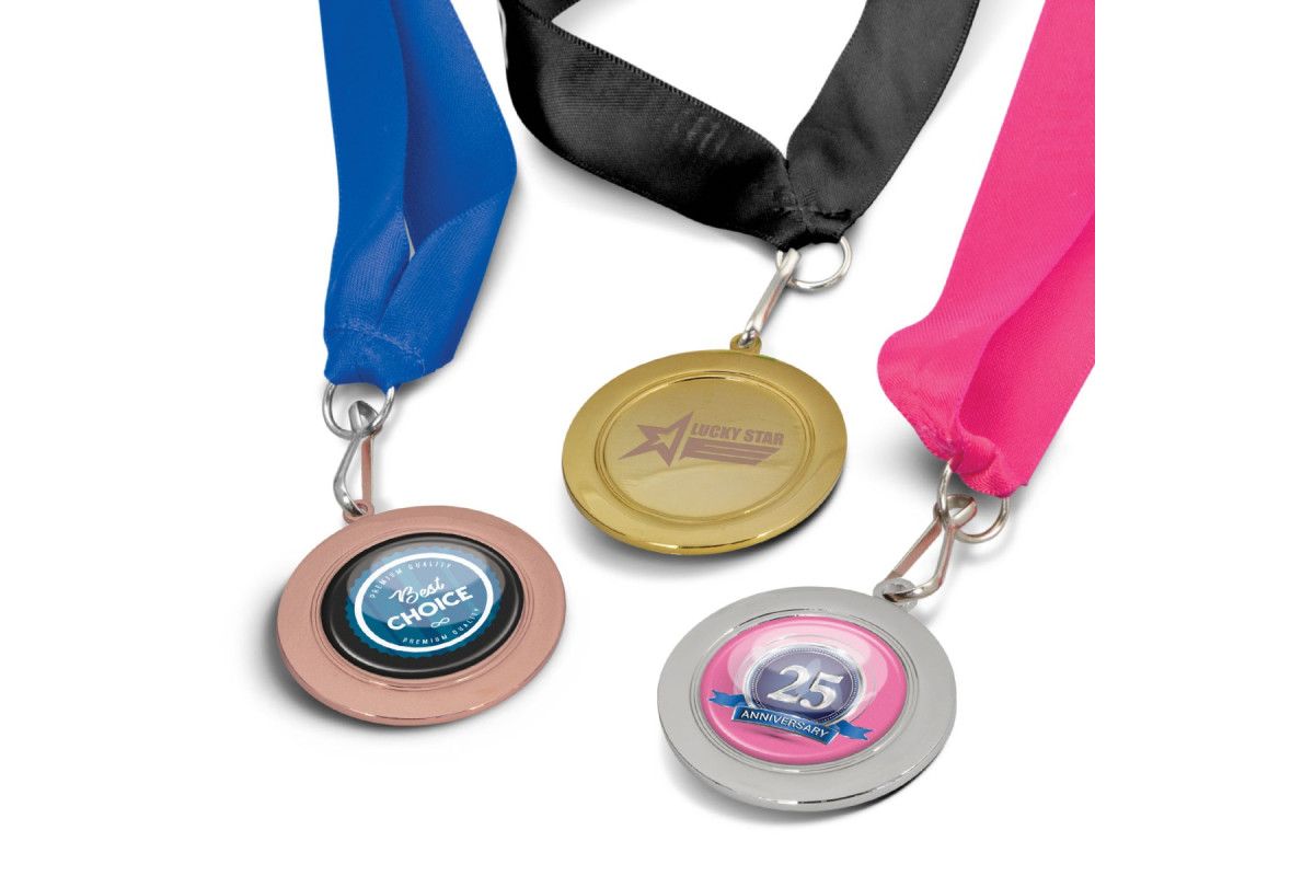 50mm diameter medal which is available in gold, silver and bronze. It can be ordered in one colour or a combination of colours at no extra cost. The medals are branded with the choice of laser engraving or a full colour resin coated finish on the front and laser engraving on the back. Each medal is supplied with a ribbon lanyard which has a safety clip and can be branded in one colour on one side. The medals laser engrave to a natural etch. Features: * A 50mm diameter medal * Available in gold, silver, or bronze * There is an option for a combination of colours at no extra cost * Each ribbon lanyard features a safety clip and one colour branding on one side * Ideal for award and competitions