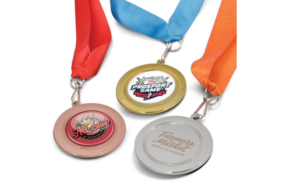 65mm diameter medal which is available in gold, silver and bronze. It can be ordered in one colour or a combination of colours at no extra cost. The medals are branded with the choice of laser engraving or a full colour resin coated finish on the front and laser engraving on the back. Each medal is supplied with a ribbon lanyard which has a safety clip and can be branded in one colour on one side. The medals laser engrave to a natural etch.