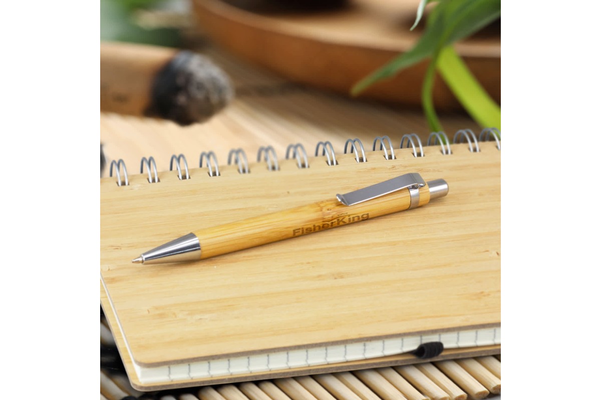 Retractable ballpoint pen with a natural bamboo barrel and shiny chrome accents. It has a black large volume refill with 1800 metres of German manufactured Dokumental ink and it can be presented in an optional gift box.