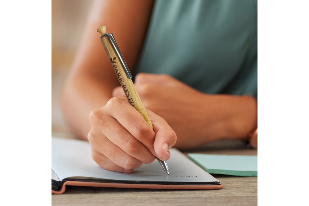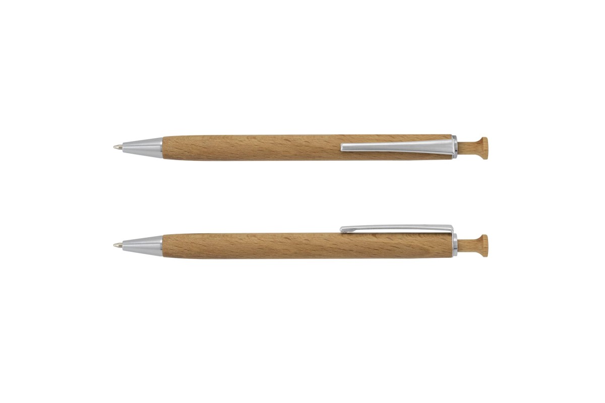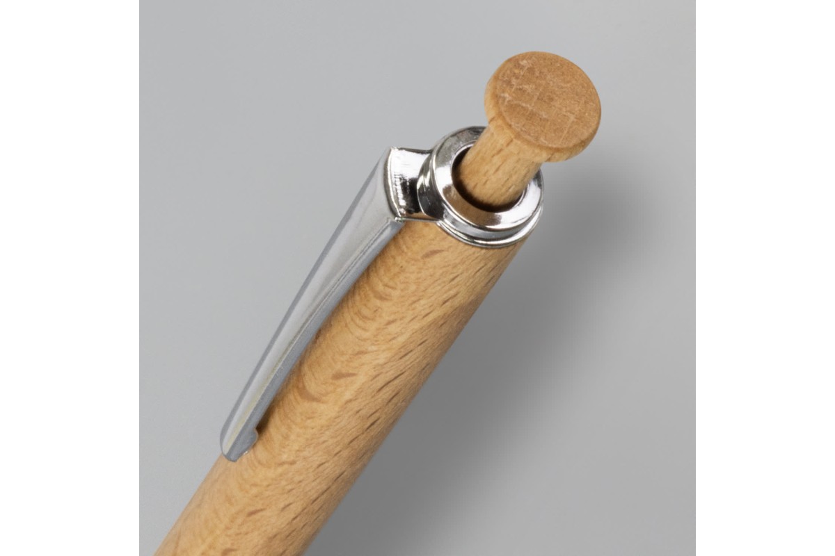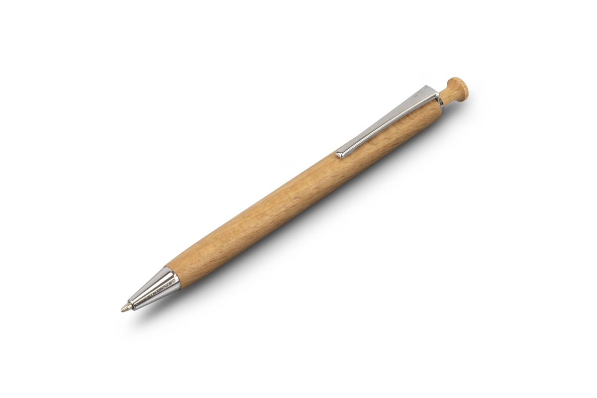 Retractable ballpoint pen made from beech wood with shiny chrome accents. It has a black refill with 1200 metres of German manufactured Dokumental ink and can be presented in an optional gift box.