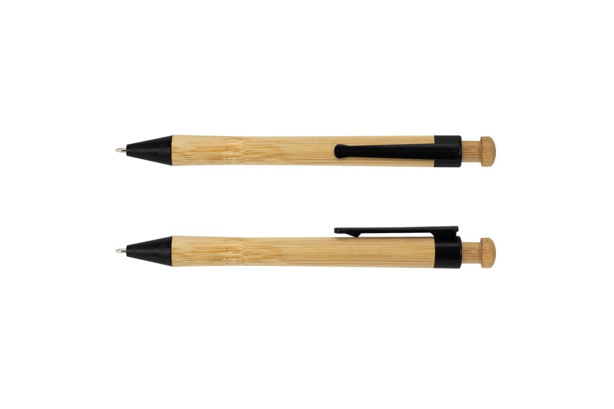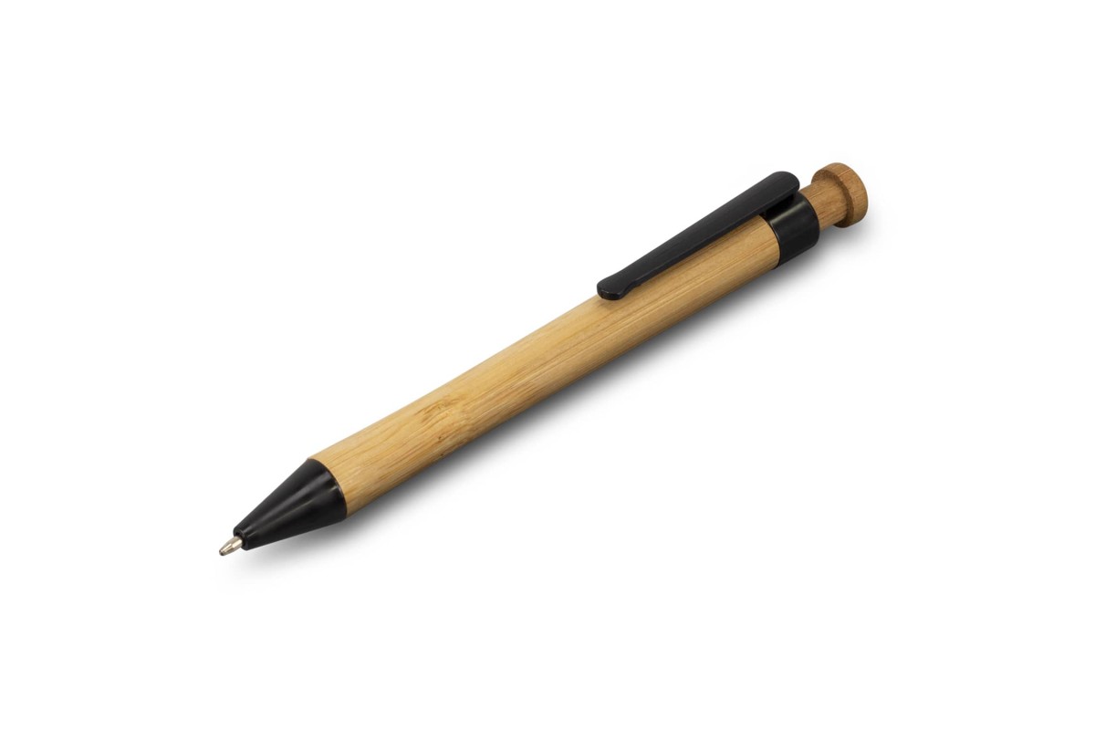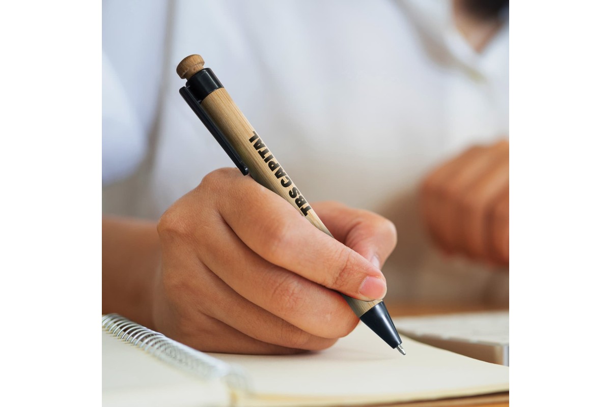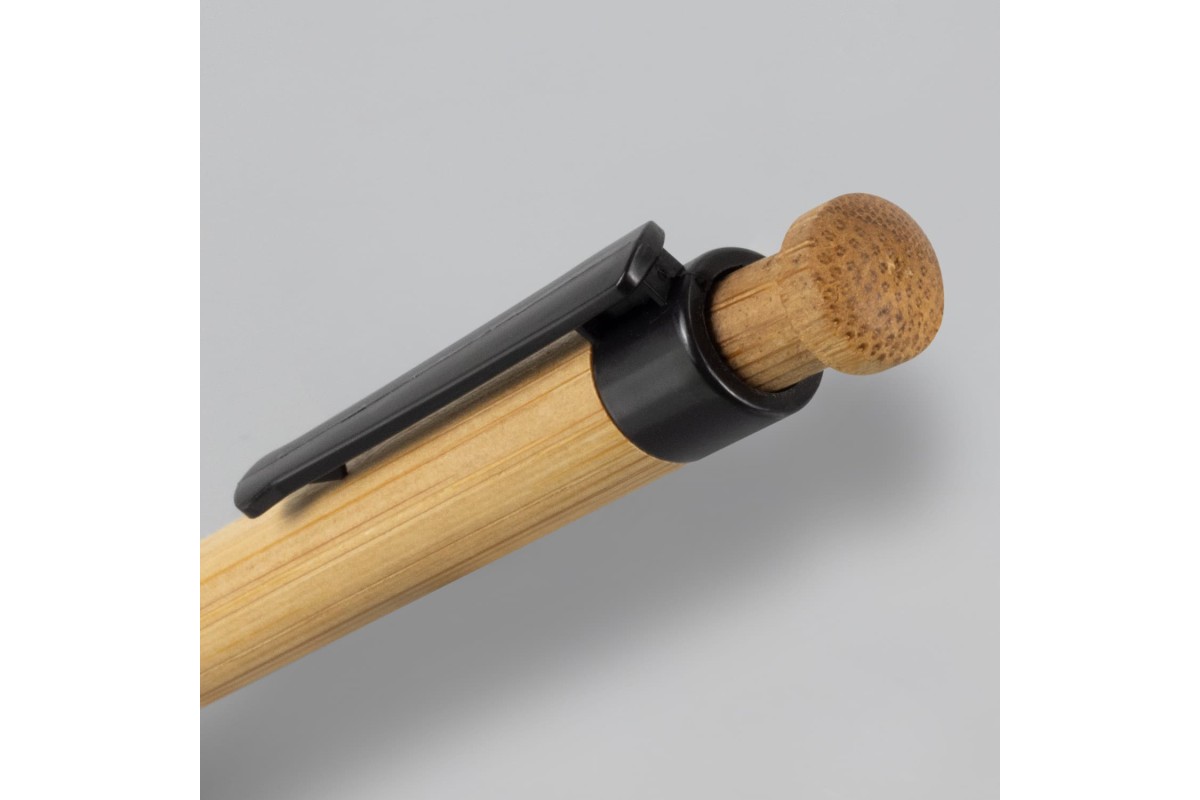Retractable ballpoint pen with a natural bamboo barrel and black trim made from PLA plastic derived from corn starch. The pen has a black large volume refill with 1200 metres of German manufactured Dokumental ink and it can be presented in an optional gift box.