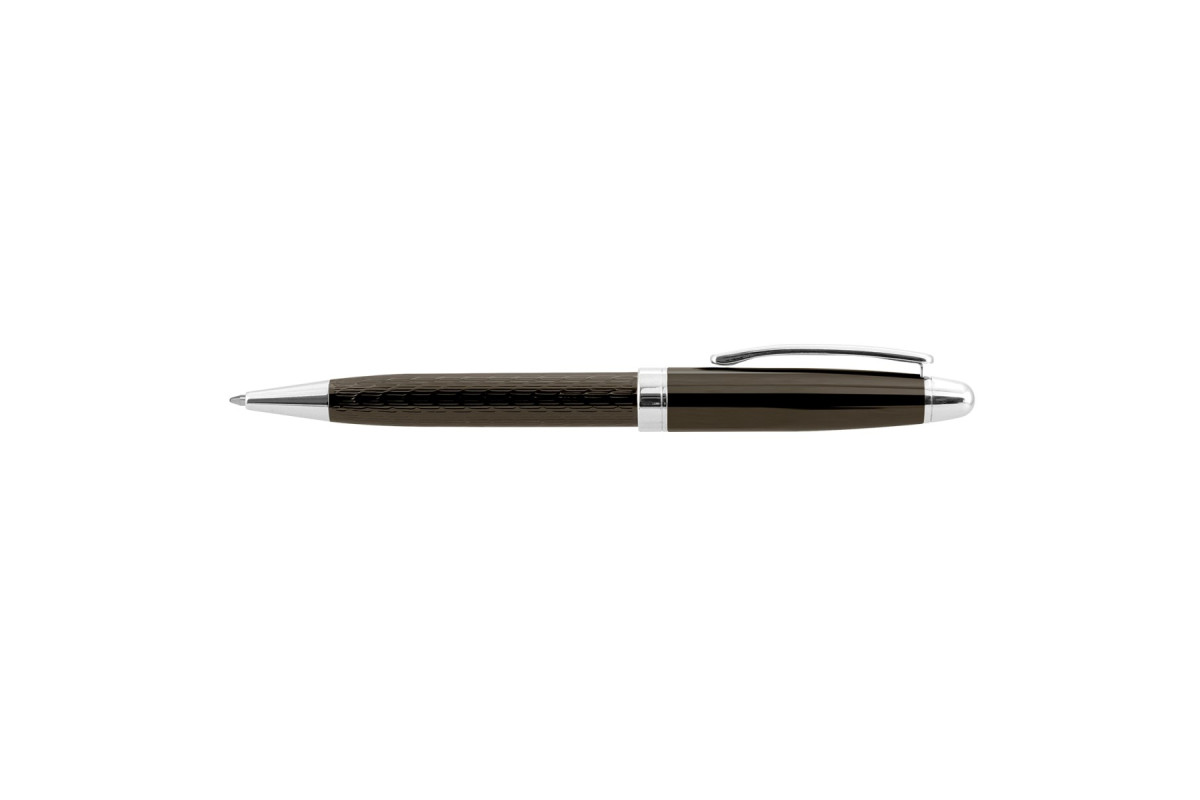 Superior twist action brass ballpoint pen with a patterned lower barrel, a smart electroplated metal finish and shiny chrome accents. It has a black large volume refill with 4000 metres of German manufactured Dokumental ink and can be presented in an optional pen case.