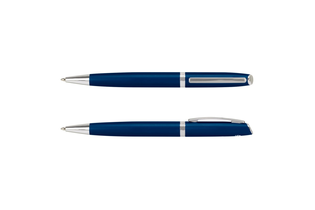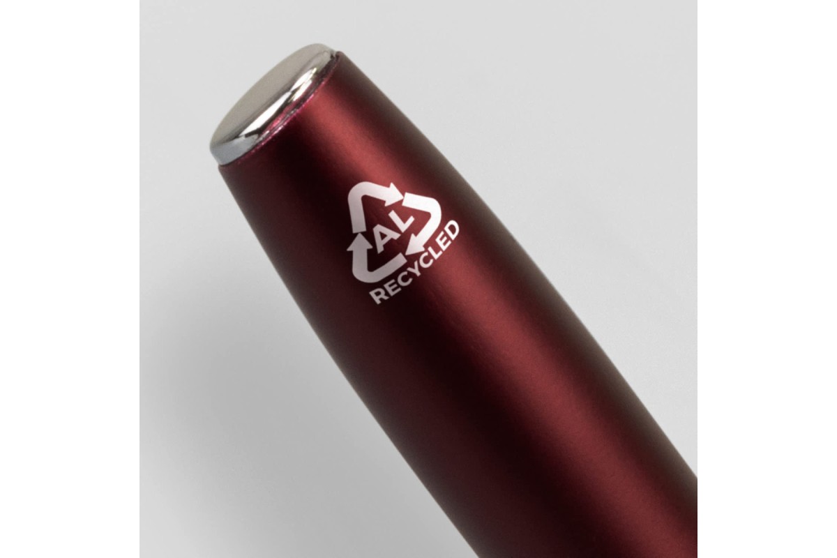 Twist-action ballpoint pen with a recycled aluminium barrel featuring a matte lacquered finish and shiny chrome trim. It has a blue refill with 1200 metres of German manufactured Dokumental ink. A recycled symbol is engraved at the top of the barrel and can be presented in an optional pen sleeve.