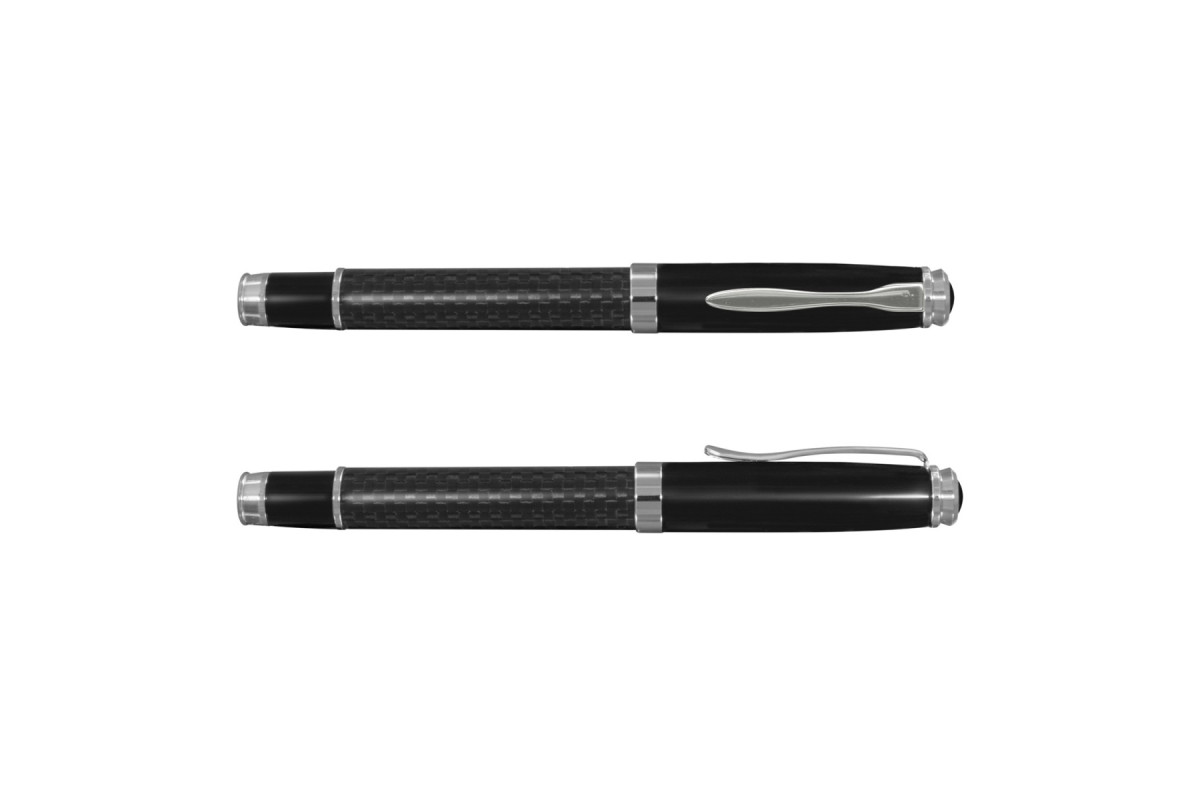 Luxury rolling ball pen with a lacquered brass cap, a genuine carbon fibre barrel and shiny chrome accents. It has a black rolling ball refill with 500 metres of writing ink that will not dry out even if the cap isn't replaced after use. Statesman can be presented in an optional black gift box.