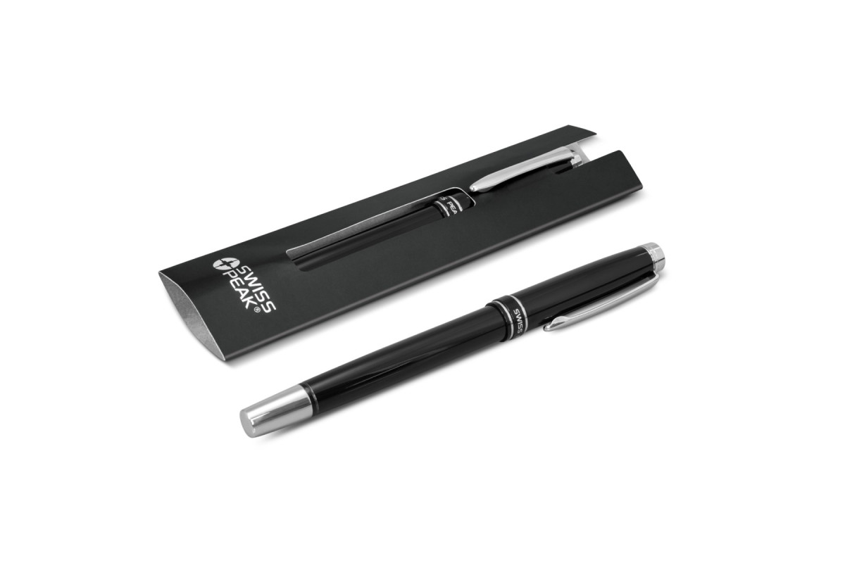 Precision Swiss Peak rollerball pen which has a lacquer finished brass barrel and shiny chrome accents. It has a blue rolling ball refill with 1200 metres of German manufactured Dokumental ink. The pen has subtle Swiss Peak branding on the centre ring and cap, and laser engraves to a brass finish. It is presented in a Swiss Peak cardboard sleeve.