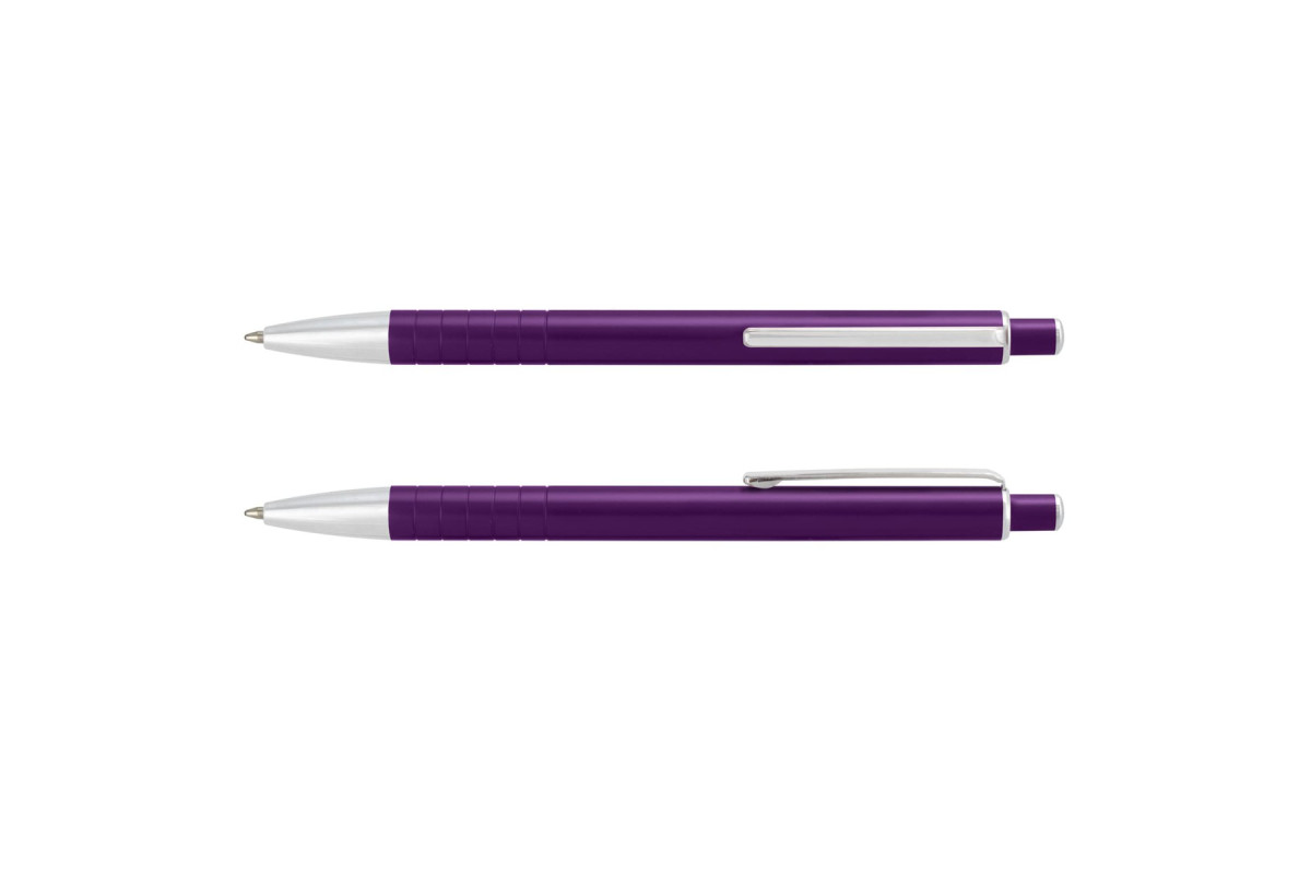Retractable aluminium ball pen with a matte anodised barrel, a unique patterned grip, and shiny chrome trim. It has 800m of black German manufactured Dokumental ink and can be presented in an optional pen sleeve.