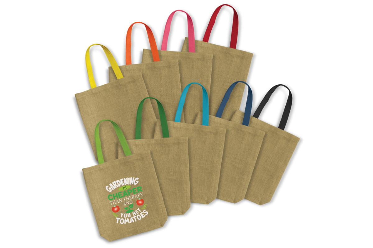 Large jute tote bag with strong cotton webbing handles. It has a gusset in the base for increased carrying capacity.