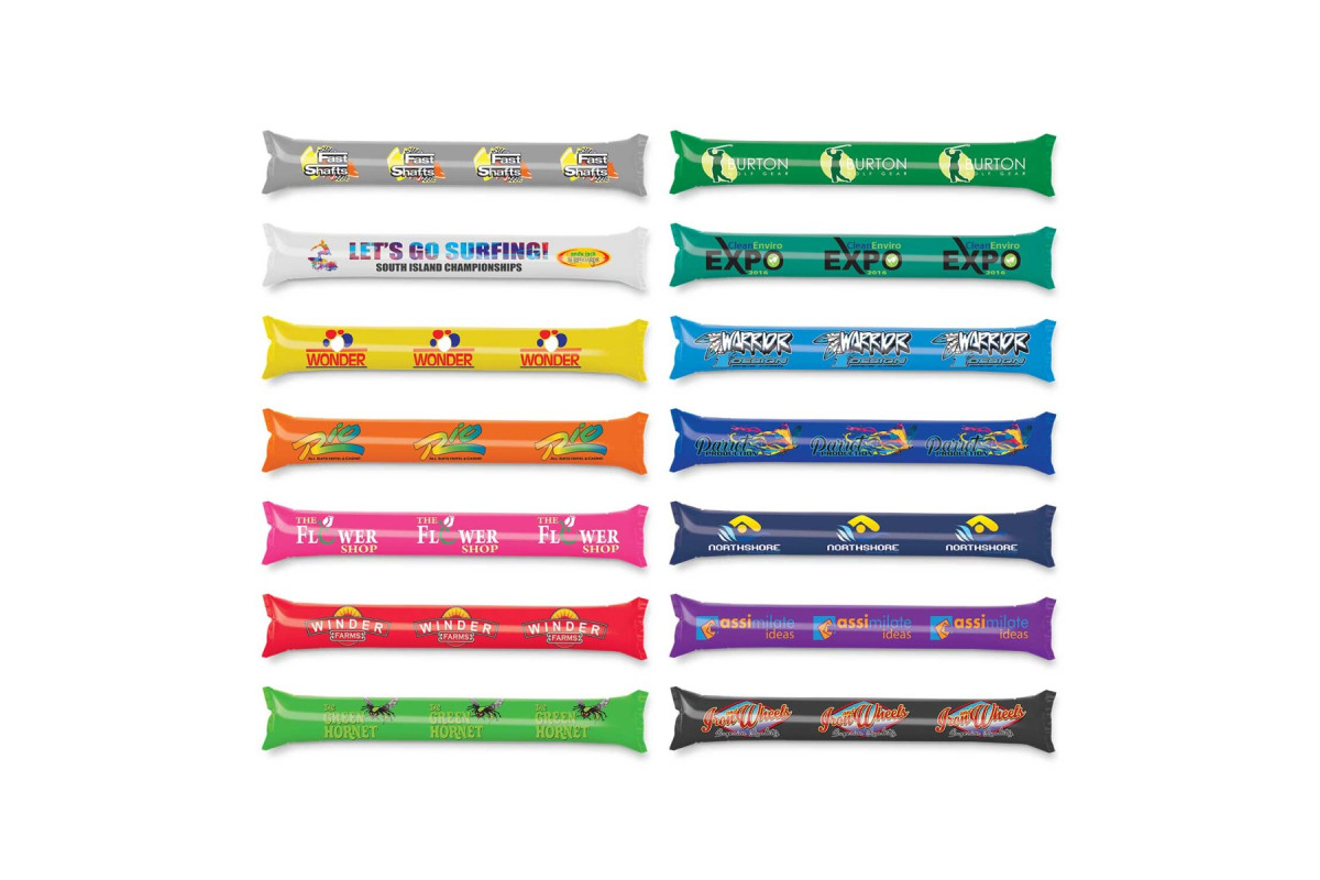 Set of two inflatable supporters sticks for sporting events which are supplied with an inflation tube. The massive print area ensures the message or logo is seen by the rest of the crowd and they are perfect for televised events. The tubes are manufactured from white plastic film and can be branded in spot colours on one or both sides. There is a setup charge for each colour including the background colours. A production lead time of 20 working days applies to this product by air freight and larger orders can be sea freighted on request to reduce the freight cost.