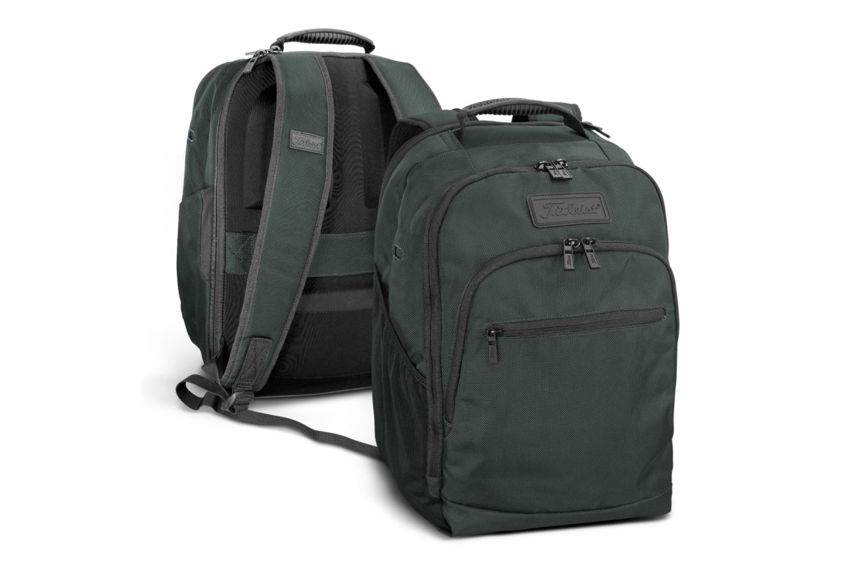 The Titleist Players Backpack combines superior quality with functional style and lives up to the brand's reputation as golf's symbol of excellence. The adjustable and breathable shoulder straps, ample foam lumbar support and spacious main compartments make it ideal for golfers or day trippers. Manufactured from durable 600D polyester it features three zippered compartments with generous internal organisation to securely stow a 15-inch laptop, books, wallets, pens and more. The smaller front compartment has a discrete internal zippered valuables pocket, a Velcro pocket, and a carabiner clip. Other features include a front zippered pocket which can be co-branded, two large side drink bottle sleeves, a sturdy rubber carry handle and a luggage strap so it can slide onto a rolling suitcase handle. The Titleist logo is subtly branded at the top of the main compartment and on the right shoulder strap. Please note this product cannot be supplied without the Titleist logo.