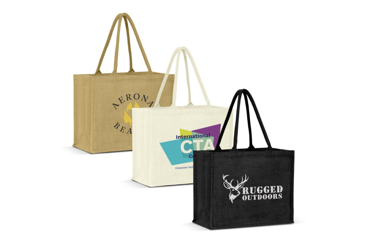 Extra-wide laminated jute tote bag with a large gusset and padded cotton handles. The bag and handles have been dyed to match.
