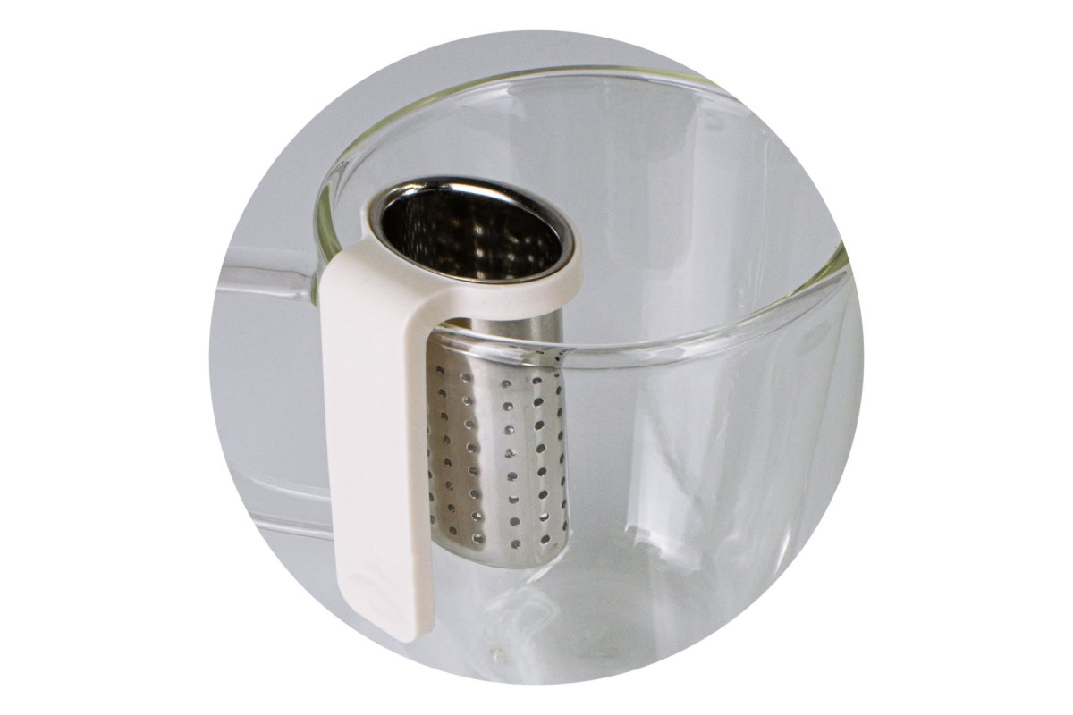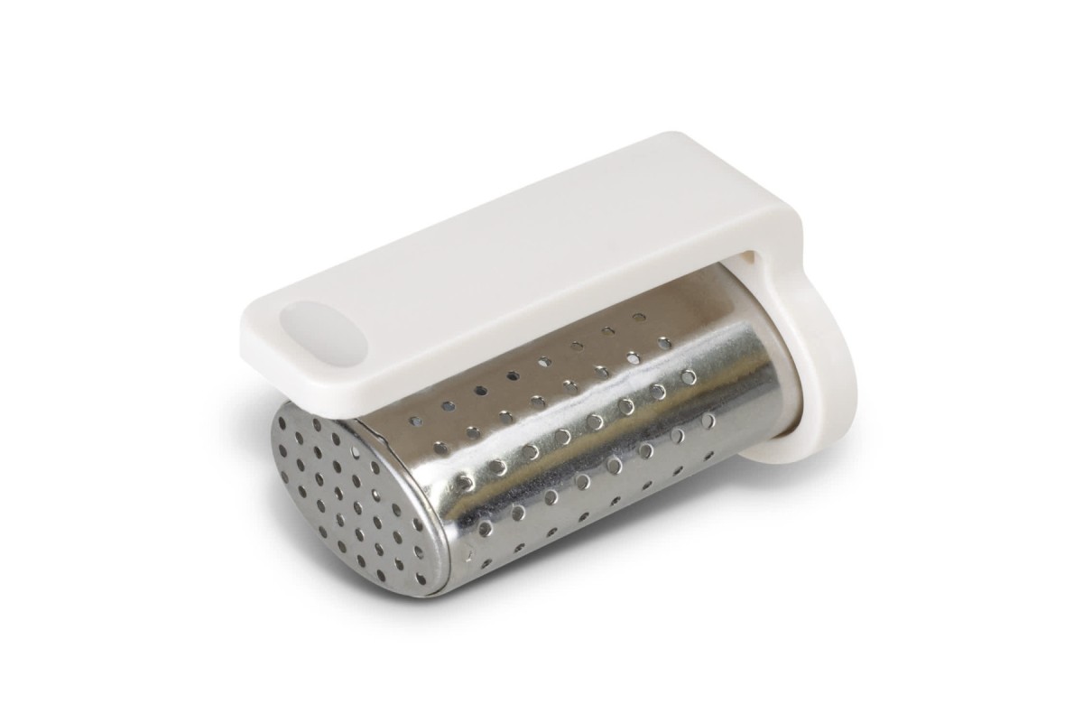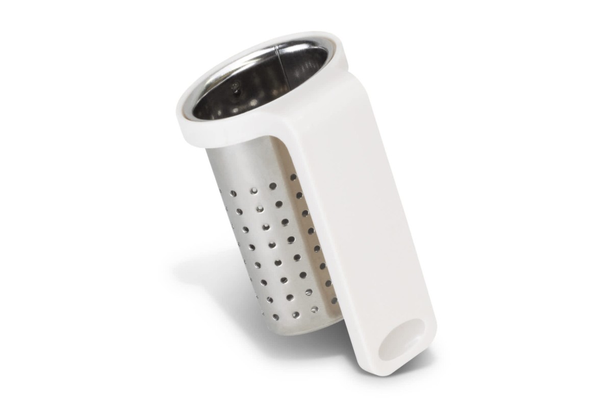 Compact tea infuser for loose leaf tea that easily clips onto the side of most mugs.