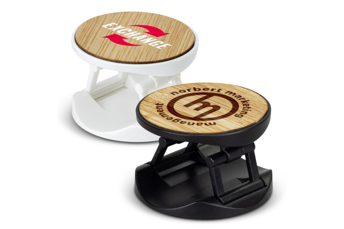 Bamboo phone holder which sticks onto the back of any mobile phone and provides grip for using the device. It is manufactured from plastic and bamboo. The phone holder also works as a stand, and it will hold a mobile phone in a horizontal position on a surface for easy viewing. Bamboo is a natural material and because the plant is fast growing, it places less demands on natural resources and produces a material that is durable and versatile. Bamboo can also produce unavoidable variances in the grain pattern, colour and branding. Features: * Bamboo phone holder which sticks onto the back of any mobile phone * Provides grip for using the device * Manufactured from plastic and bamboo