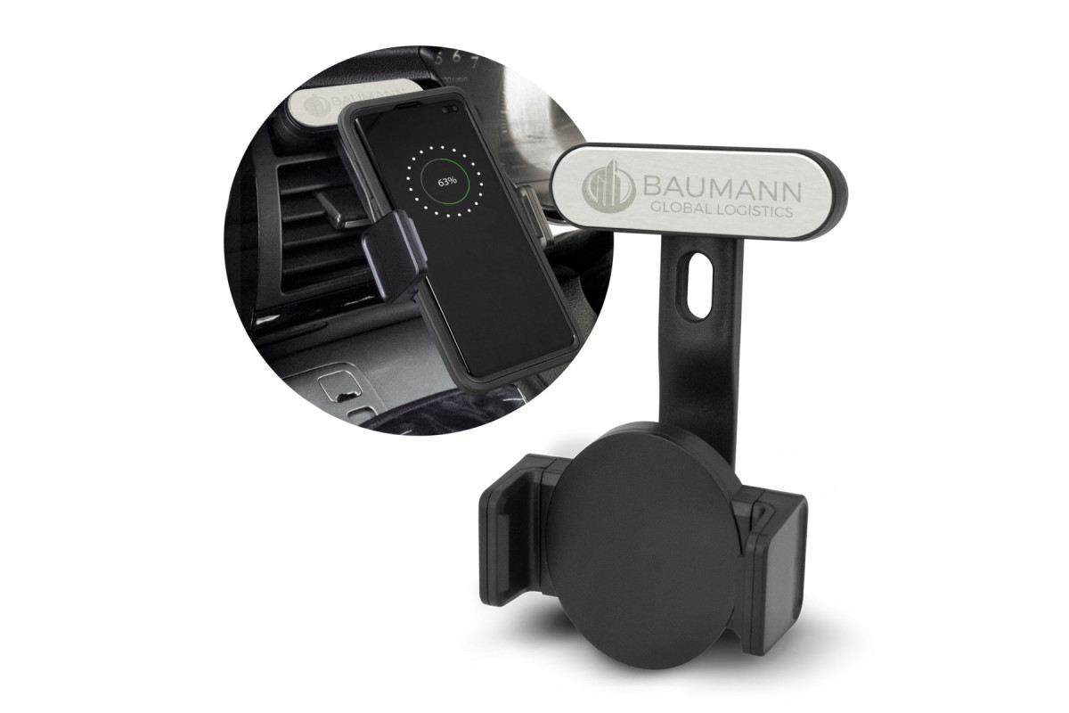 Unique spring-loaded car phone holder which has a built in 5W wireless charger. It has a soft rubber clip which pushes onto car air vents and securely holds a phone so it can be used and charged at the same time. Simply plug the unit into the USB port of a car adapter and it is ready for use. It is compatible with devices that are enabled for wireless charging and will charge most modern phones. Zamora has a handy slot in the back for the cable to pass through and a very prominent branding area. It is supplied with a Micro-B USB cable and an instruction leaflet. Please note that some phone cases may affect the wireless charging connection. Features: * Spring-loaded car phone holder which has a built in 5W wireless charger * Soft rubber clip which pushes onto car air vents and securely holds a phone * Micro-B input