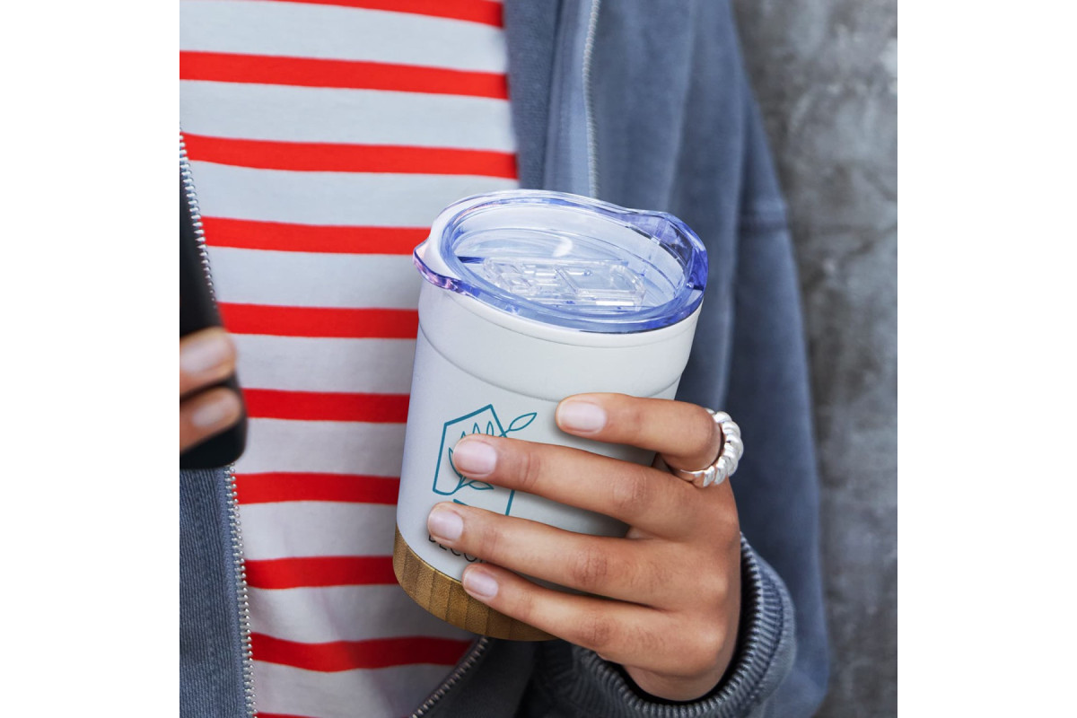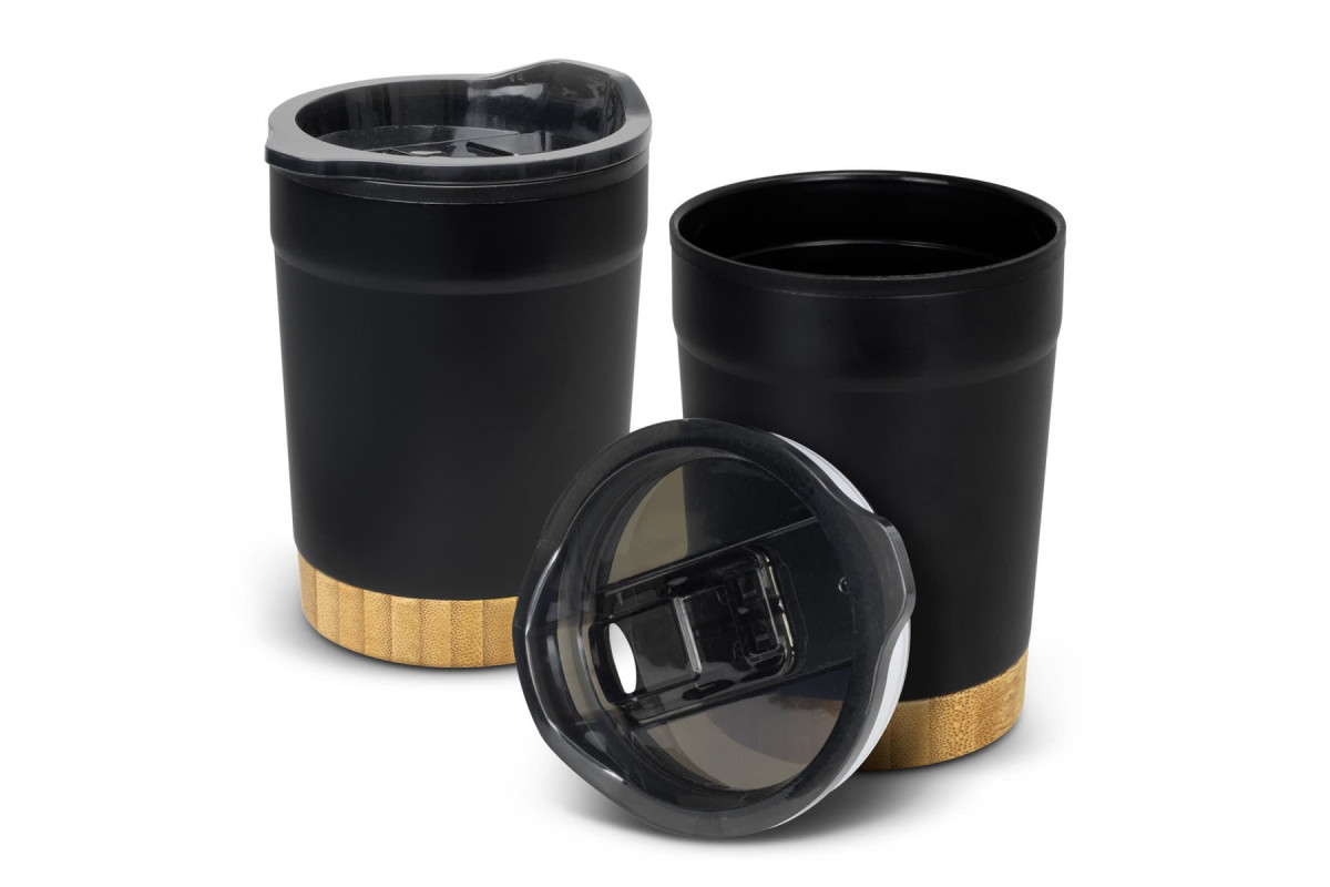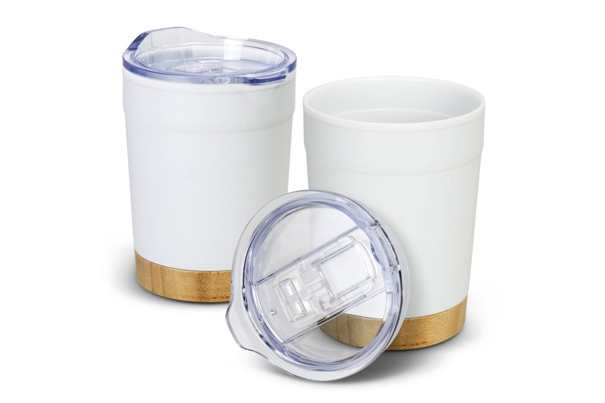 Stylish 350ml double wall, polypropylene and stainless steel coffee cup with natural bamboo base. Valetta features a translucent splashproof, push on, BPA-free slider lid with a secure silicone seal. Features: * 350ml double wall, polypropylene and stainless steel coffee cup * Splashproof slider lid * Bamboo base * BPA-free * Optional gift box and gift box sleeve available at an additional cost