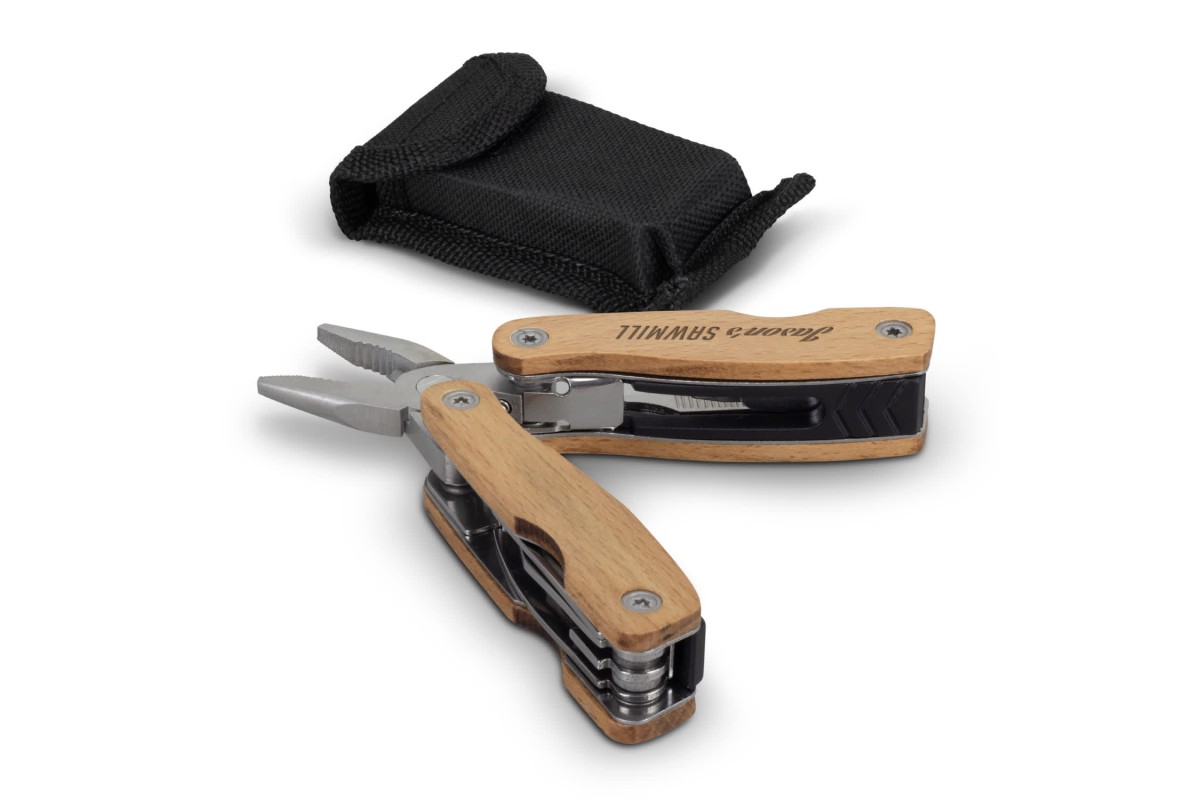 Compact 9-function multi-tool which opens out to reveal spring-loaded pliers and eight additional tools for everyday use: a knife, can opener, saw, flat, slotted and Phillips screwdriver, bottle opener, and a nail file. The Beech wood handles add a stylish element, and the tool is supplied in a carry pouch with a Velcro closure and a belt loop.