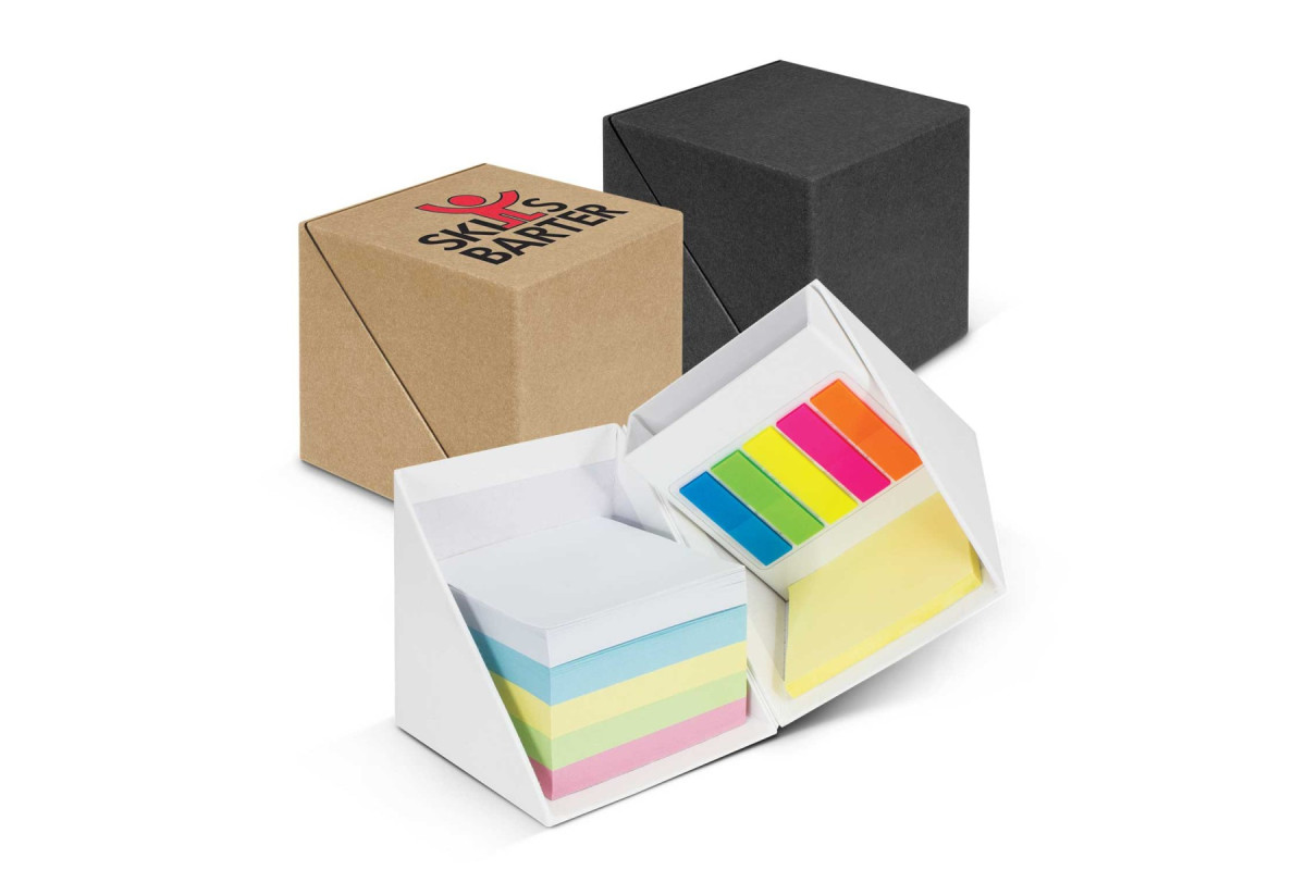 Smart cardboard box which flips open to reveal a handy desk set. It includes a block of multi-coloured note paper, a pad of yellow adhesive notes, five pads of different coloured adhesive flags and a pen cup.