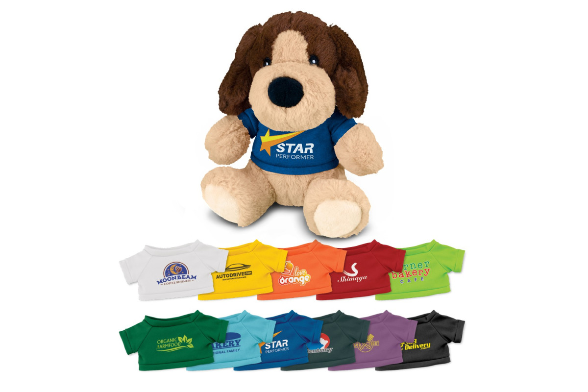 Soft dog plush toy with embroidered eyes, RPET filling and a polyester t-shirt which is available in eleven colours. Plush animals provide a cute and cuddly branding option and are great for brand recognition and spreading goodwill. They have also been manufactured to meet with AS/NZS Safety Toy Standards.