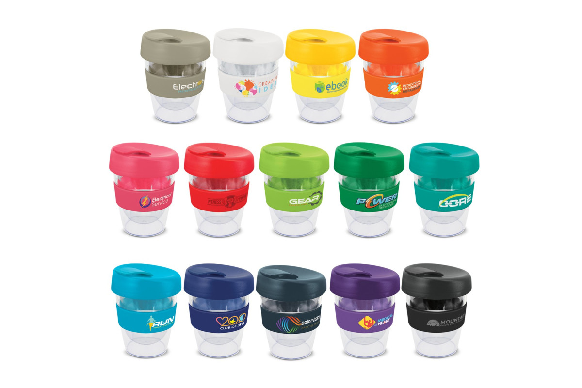 Reusable 230ml double wall coffee cup which will keep drinks hot for longer. It has a silicone band and a secure screw on lid with a splashproof flip closure. The cup is manufactured from crystal-clear AS plastic and the lid is polypropylene. Both materials are BPA-free. The lid, flip closure and band can be mixed and matched in any colour combination from the standard colours at no extra cost. Up to five different colour combinations are included in the price and more are available for an additional charge. An optional natural gift box is available on request. This product is not dishwasher safe and handwashing is recommended. Express Cup Leviosa is protected under New Zealand Design Registration No. 419451 and Australian Design Registration No. 361937.