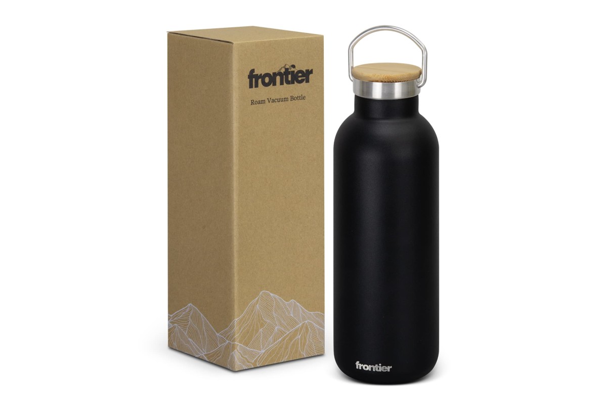 The Frontier 600ml recycled stainless steel double wall vacuum bottle is designed for adventurers and outdoor enthusiasts. Its sleek matte black powder coat finish is not only stylish but also highly durable, perfect for withstanding the rigors of the outdoors. Features a stylish screw on lid, with a bamboo and stainless steel finish and convenient carry handle. Designed to keep your beverages cold for 24 hours or hot for up to 12 hours, this bottle is an essential companion for any outdoor activity. The bottle laser engraves to a shiny steel finish and is presented in natural kraft packaging with Frontier branding.
