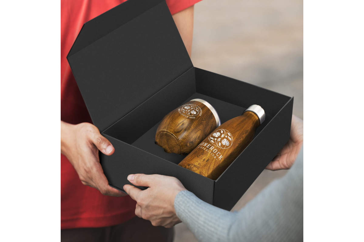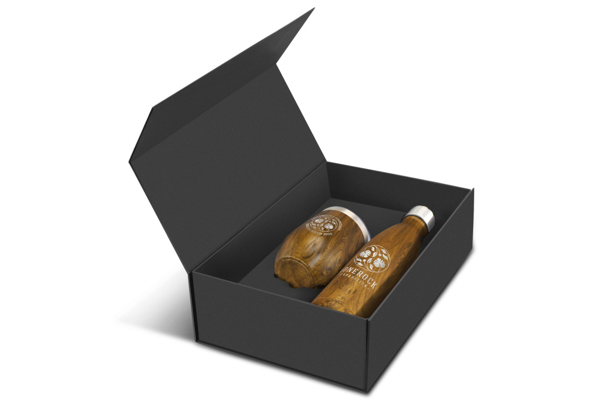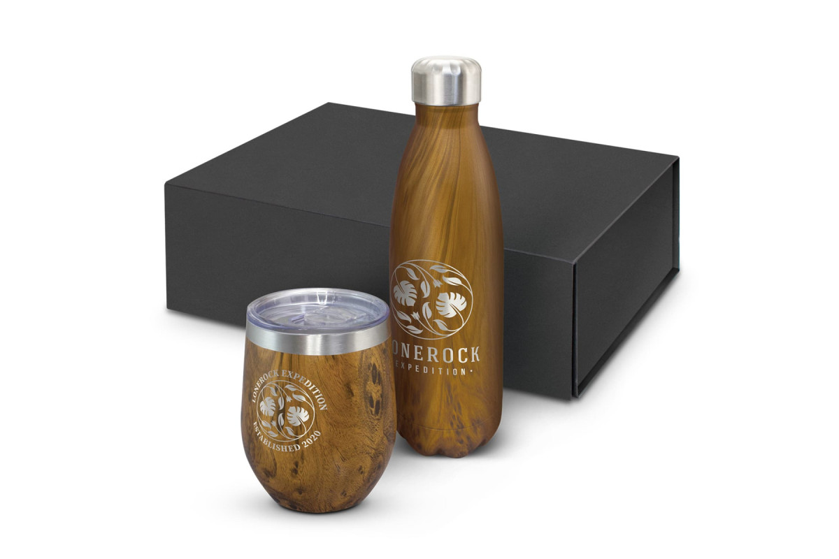 Superb double wall, vacuum insulated stainless steel drinkware set which is beautifully presented in a natural or black gift box. It includes a 500ml Mirage Heritage Vacuum Bottle and a 300ml Cordia Heritage Vacuum Cup which both have a deluxe wood grain finish. Mirage has a secure screw-on stainless steel lid and will keep drinks cold for up to 24 hours and hot for up to 12 hours. Cordia has a transparent push-on lid with a sliding closure and will keep drinks hot for up to three hours. Both items are BPA-free and laser engrave to a shiny steel finish. These products are not dishwasher safe and handwashing is recommended.