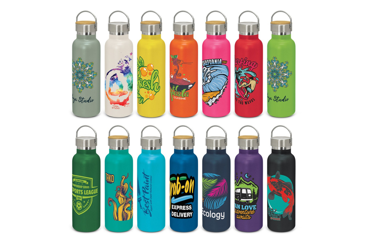 Impressive 650ml BPA-free, double wall, vacuum insulated stainless steel drink bottle which has an extremely durable powder coated matte finish. It will keep drinks cold for 24 hours or hot for up to 12 hours. It has a trendy screw on lid with a stainless steel carry handle that offers a prominent branding opportunity and is available in full stainless steel or with a bamboo veneer. Bamboo is a natural material which produces unavoidable variances in the grain pattern, colour and branding. The lid laser engraves to a natural etch and the bottle laser engraves to a shiny steel finish. It is nicely presented in a black gift box or an