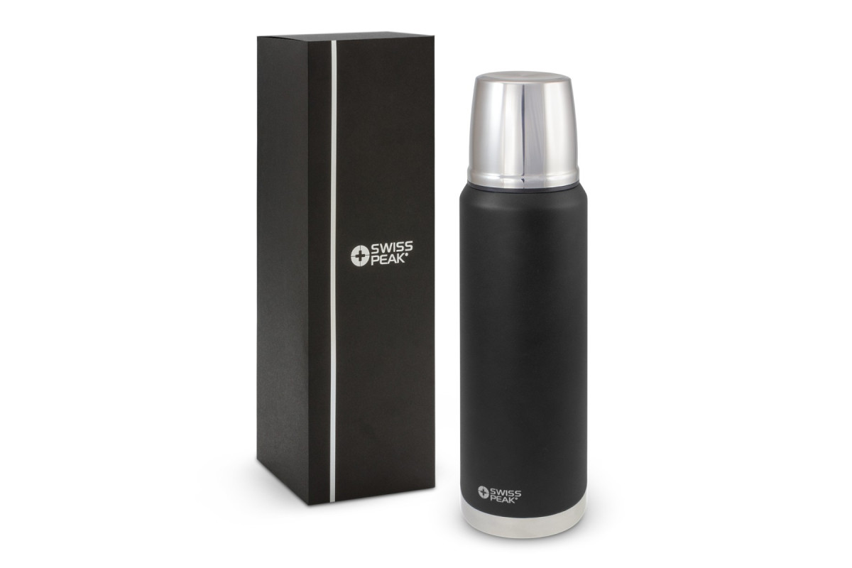Stylish one litre double wall, vacuum insulated stainless steel flask. It has a unique copper lining on the inner wall which improves its performance and the outer wall has a tough powder coated finish. Elite will keep drinks hot for up to 12 hours and cold for up to 24 hours. It has a secure lid with convenient push button pouring and its own screw on cup. This precision vacuum flask is BPA-free and laser engraves to a shiny steel finish. It is presented in a Swiss Peak gift box with an information leaflet included. This product is not dishwasher safe and handwashing is recommended.