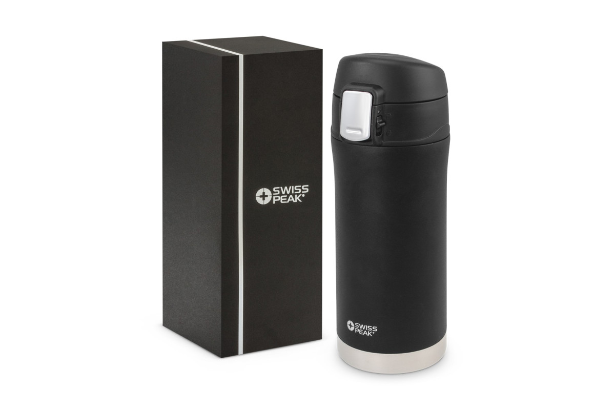 Premium 300ml double wall, vacuum insulated stainless steel coffee mug. It has a unique copper lining on the inner wall which improves its performance and the outer wall has a tough powder coated finish. Elite will keep drinks hot for up to 12 hours and cold for up to 24 hours. It features a secure screw on lid with a push button activated flip closure which is spring loaded for smooth, effortless operation. The locking mechanism on the lid prevents leaks and spills even if the cup is knocked over. This precision coffee mug is BPA-free and laser engraves to stainless steel finish. It is presented in a Swiss Peak gift box with an information leaflet included. This product is not dishwasher safe and handwashing is recommended.