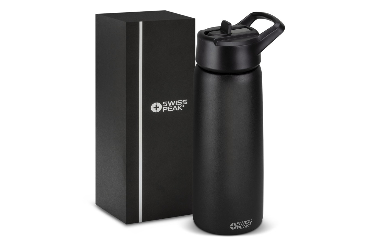 Stylish Swiss Peak 750ml double wall, vacuum insulated stainless steel drink bottle with a smart powder coated finish. It has a secure screw on lid with a carry handle and a flip-out drinking valve. The valve has a removable silicone mouthpiece for easy cleaning. This precision bottle is BPA-free, and laser engraves to a shiny steel finish. It is presented in a Swiss Peak gift box with an information leaflet. This product is not dishwasher safe, and handwashing is recommended.