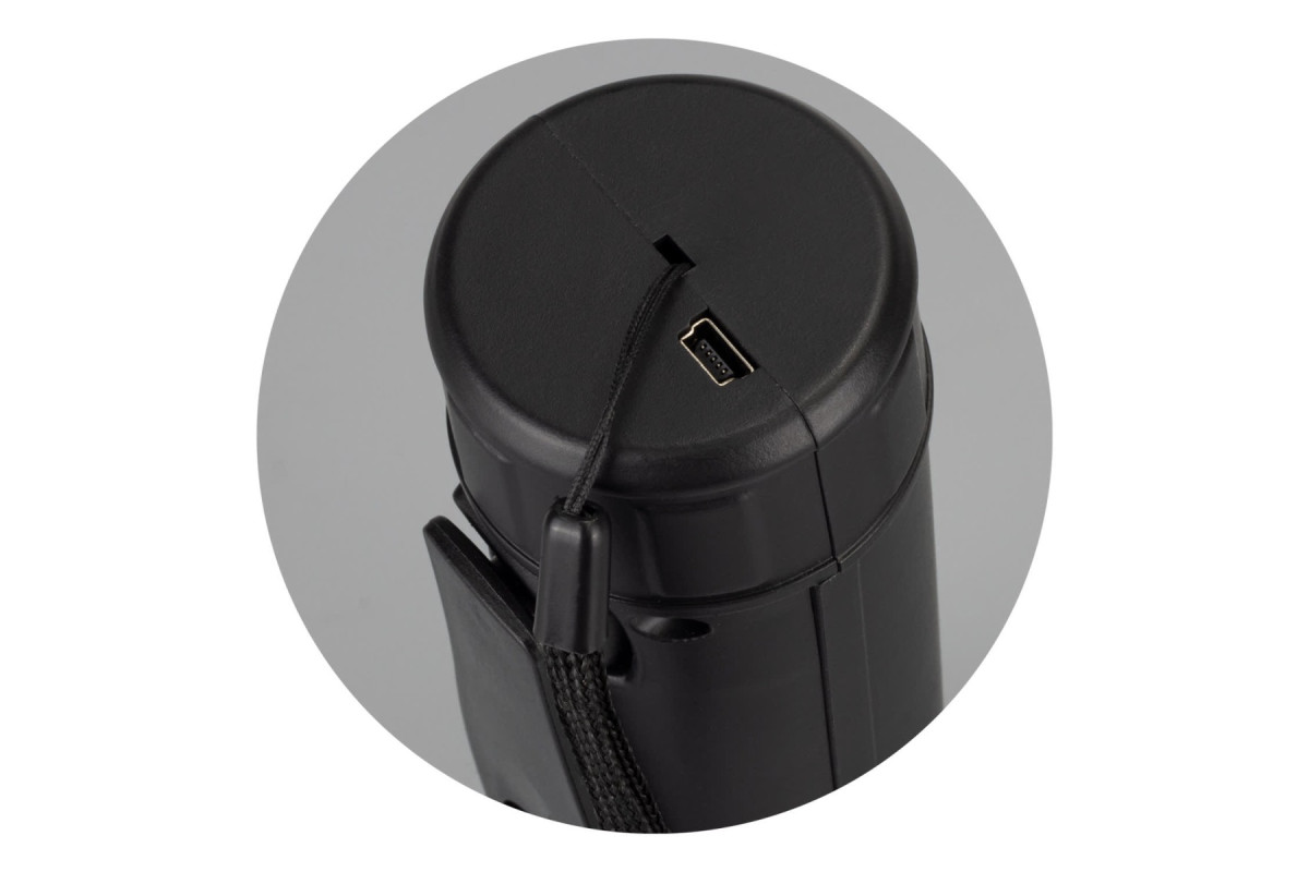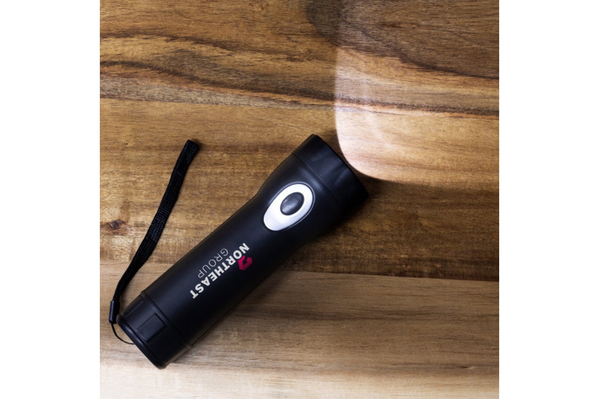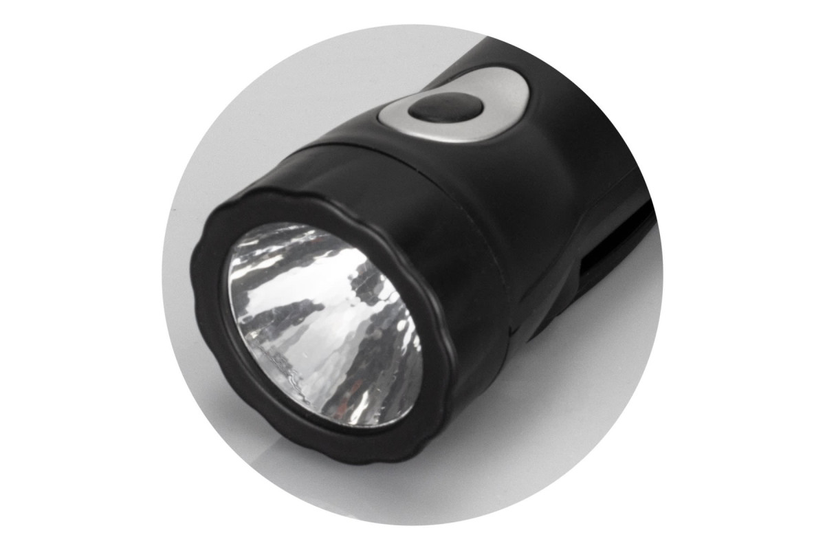 Handy rechargeable matte black torch with silver trim. Made from ABS plastic, Dynamo can be recharged using the crank mechanism or a USB connection.