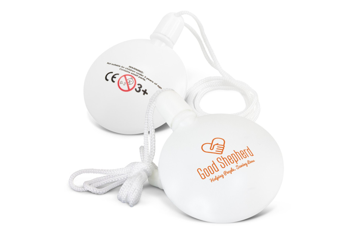 Fun bubble making kit with a lanyard and a secure screw cap which has a bubble wand attached. It contains 30ml of non-toxic, non-staining bubble making liquid.