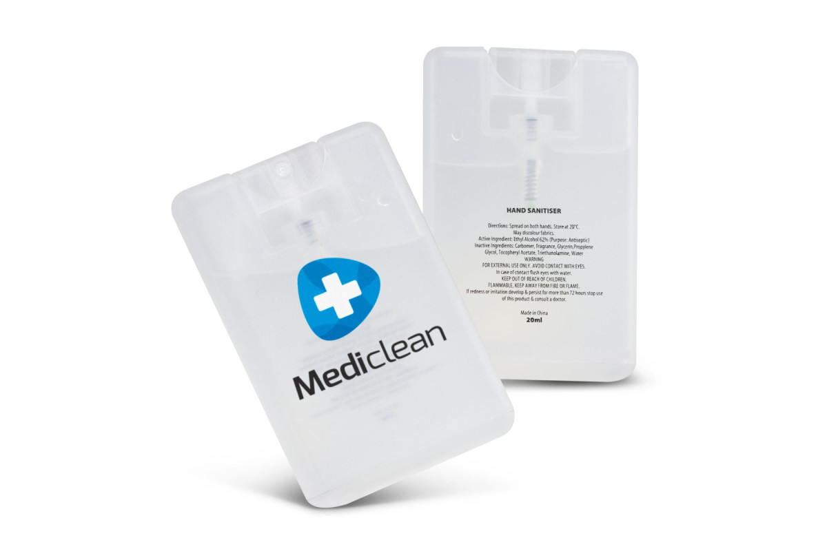 Unique 20ml credit card shaped, pump action hand sanitiser. It has a large branding area on the front with full ingredient information printed on the back.