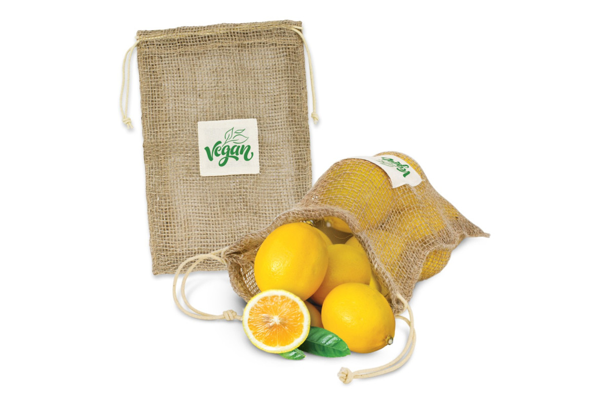 This unbleached jute net produce bag can be reused many times. It is designed for transporting fruit and vegetables while allowing them to breathe so they arrive home in the best possible condition. It has a drawstring closure and an unbleached cotton patch for branding.