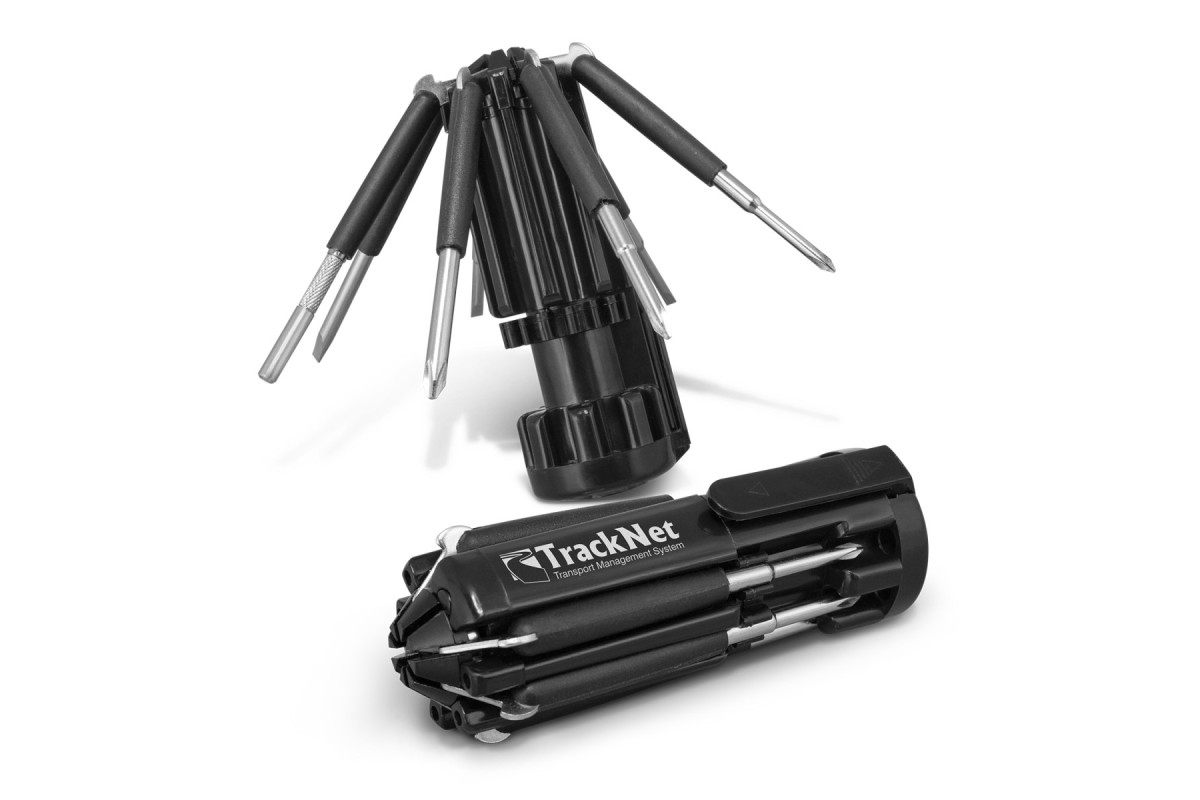 Compact nine-function multi-tool with a clip which has seven tools that flip out of the main housing and lock in place. It contains four Phillips screwdrivers and four conventional screwdrivers. The tool also has a flashlight with six powerful LEDs that use two AAA batteries which are included.