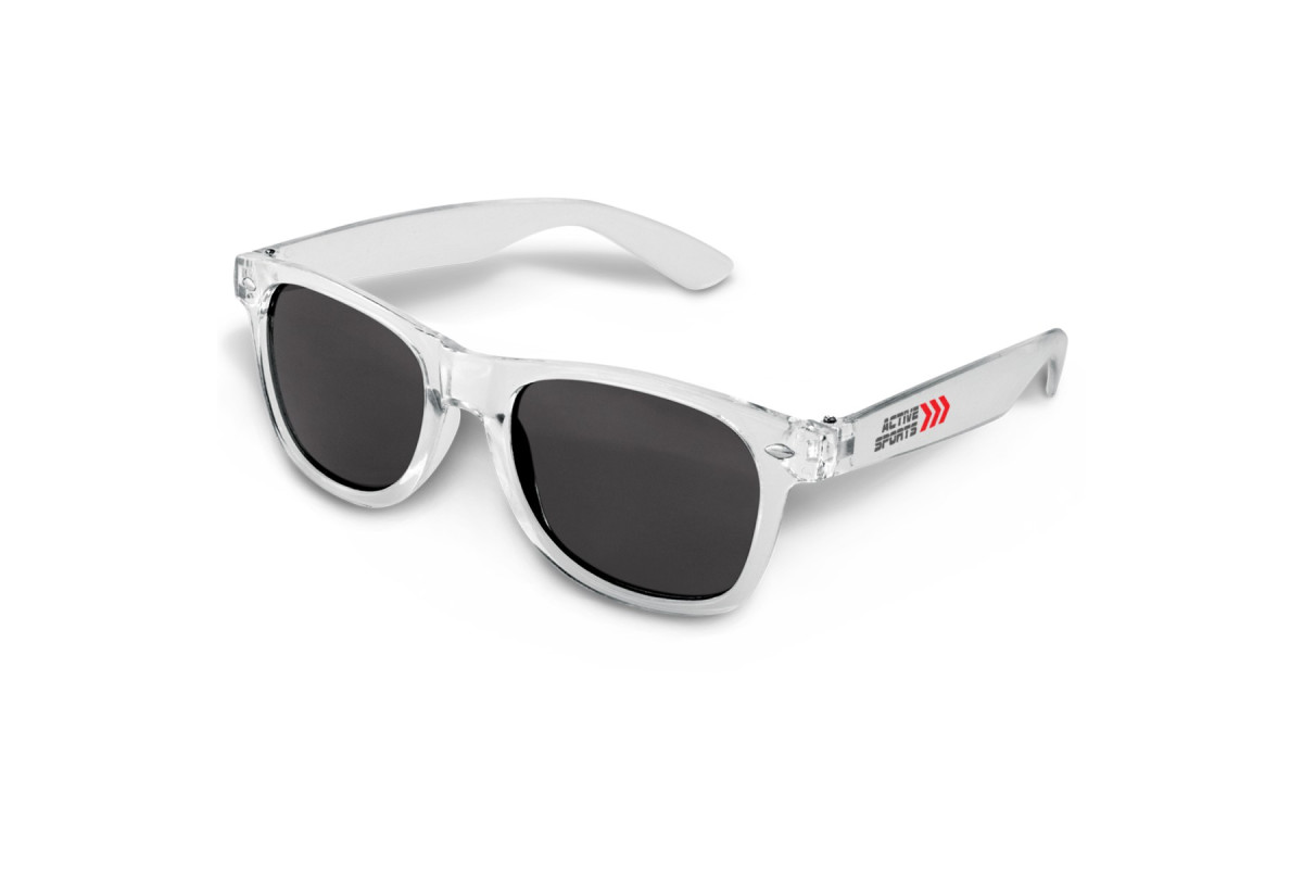 Retail quality fashion sunglasses with an impact resistant translucent polycarbonate frame and arms which are fitted with CE standard 100% UV 400 lenses that provide both UVA and UVB protection. They can be supplied in an optional microfibre pouch for an additional cost.
