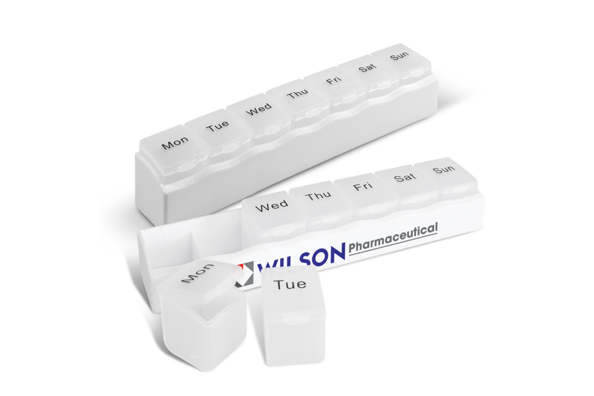 Unique medication organiser featuring seven individual pill compartments. Each compartment is conveniently removable and clearly labelled with the day of the week for easy medication management.