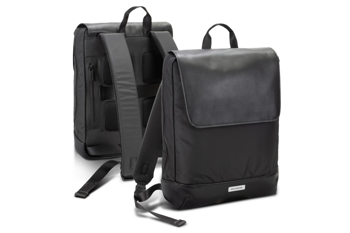 The Moleskine Metro Slim Backpack is an urban lightweight backpack designed to go with you everywhere and carry the day's essentials. This luxury backpack features a flap with magnetic closure and a water-resistant zip to keep all your essentials safe. Inside, the backpack features an organizer, two pen holders, a business card holder, a secure pocket and an inner compartment to protect your laptop. The Metro Slim is fitted with an adjustable padded shoulder strap and breathable air-mesh back for exceptional comfort on the go and a rear luggage sleeve will slide over the handle of a rolling suitcase. A reflective Moleskine logo is sewn onto the leather-look PU base of the backpack. Please note this product cannot be supplied without the Moleskine logo. Moleskine reserves the right to decline any custom project or artwork that does not align with its brand on a case-by-case basis.