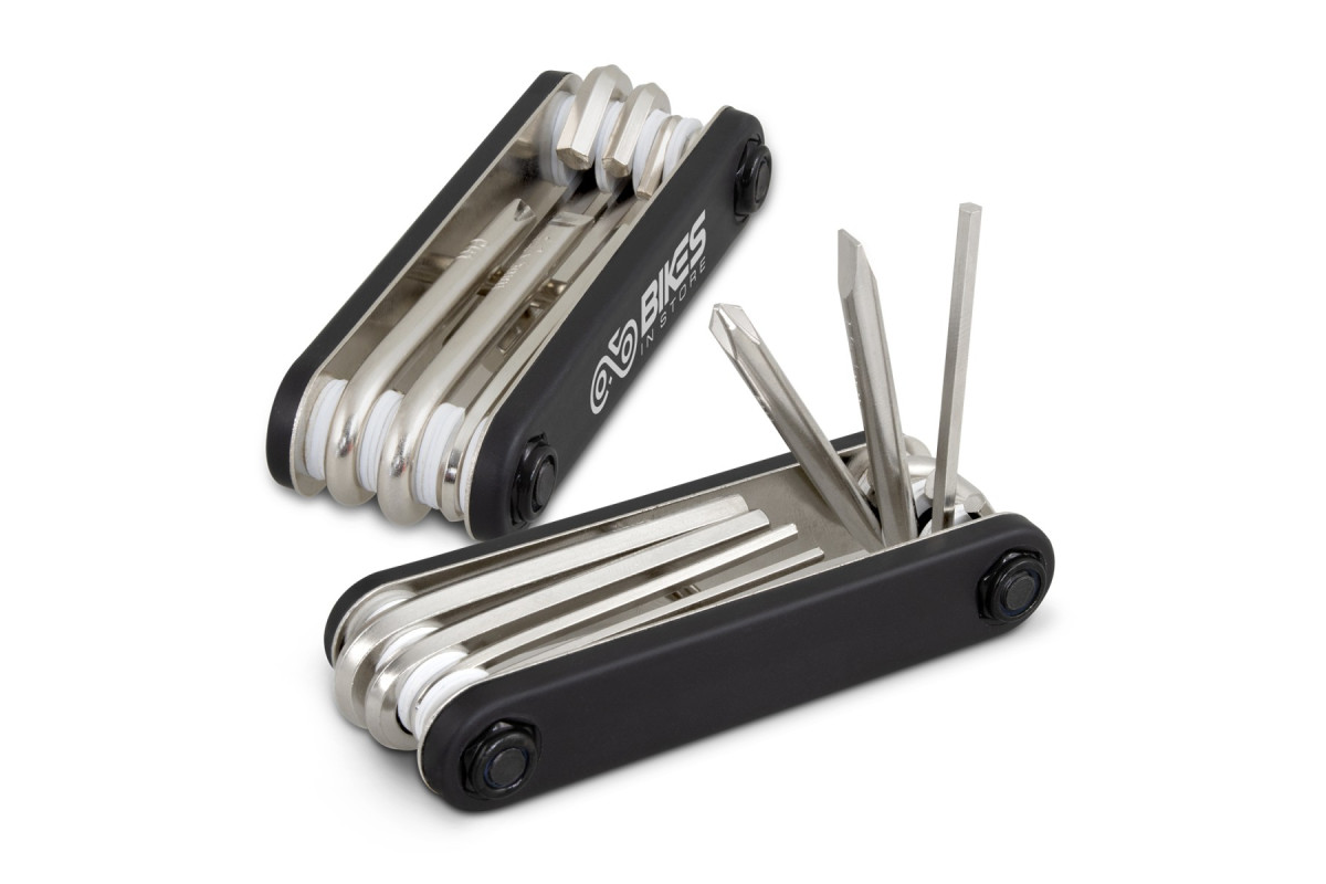 Smart seven-piece set of powder coated tools in a compact, pocket-size multi-tool. It has five different size Allen keys, a Phillips screwdriver and a conventional screwdriver.