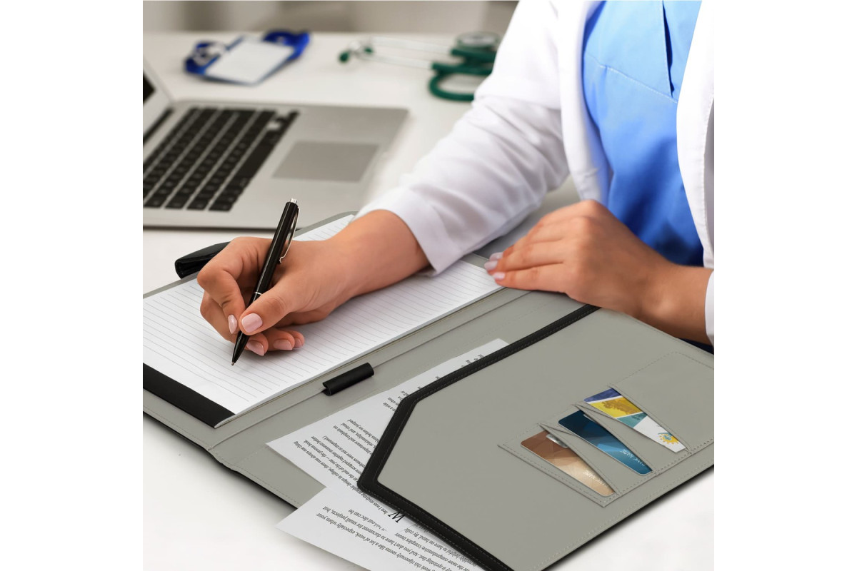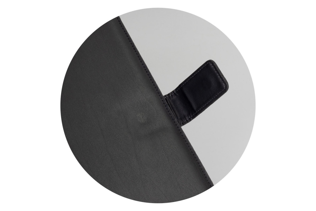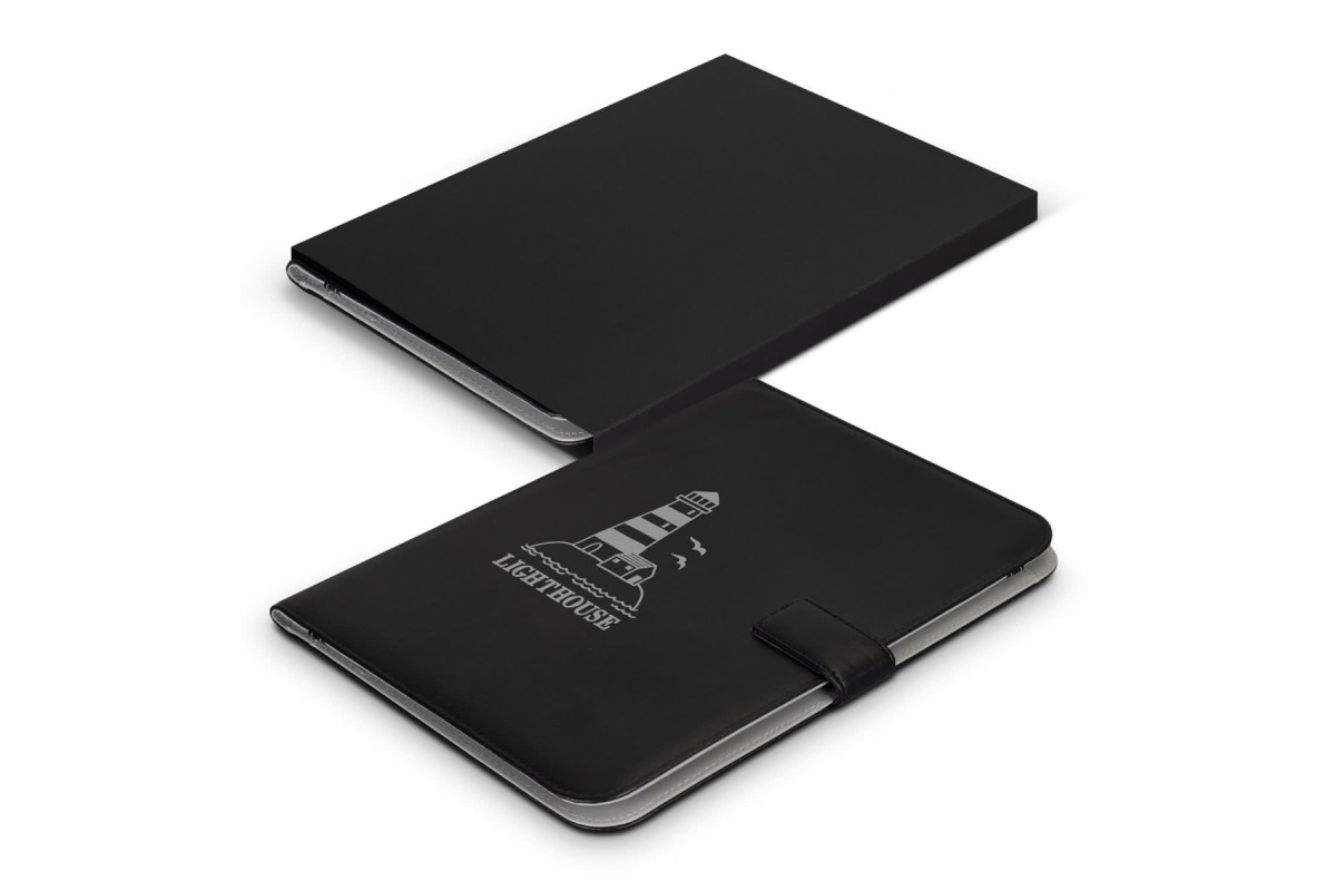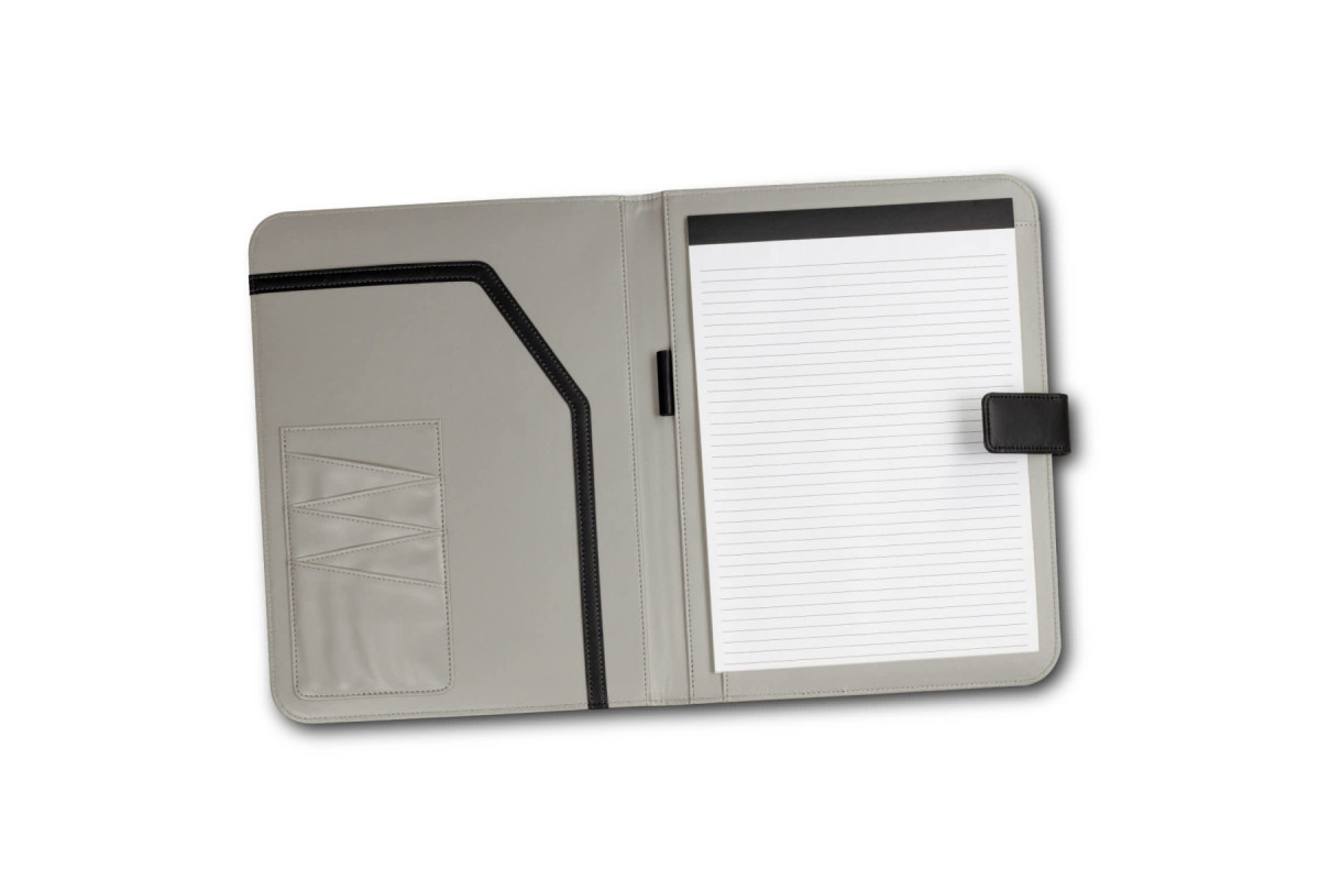 Professional PU leather portfolio with a magnetic strap closure. It comes with an A4 lined pad, one main pocket, five business card holders, and one pen loop. It is presented in an individual black cardboard sleeve. Features: * PU portfolio with magnetic strap closure * A4 lined pad * One main pocket, 5 business card holders and one pen loop * Presented in an individual black cardboard sleeve
