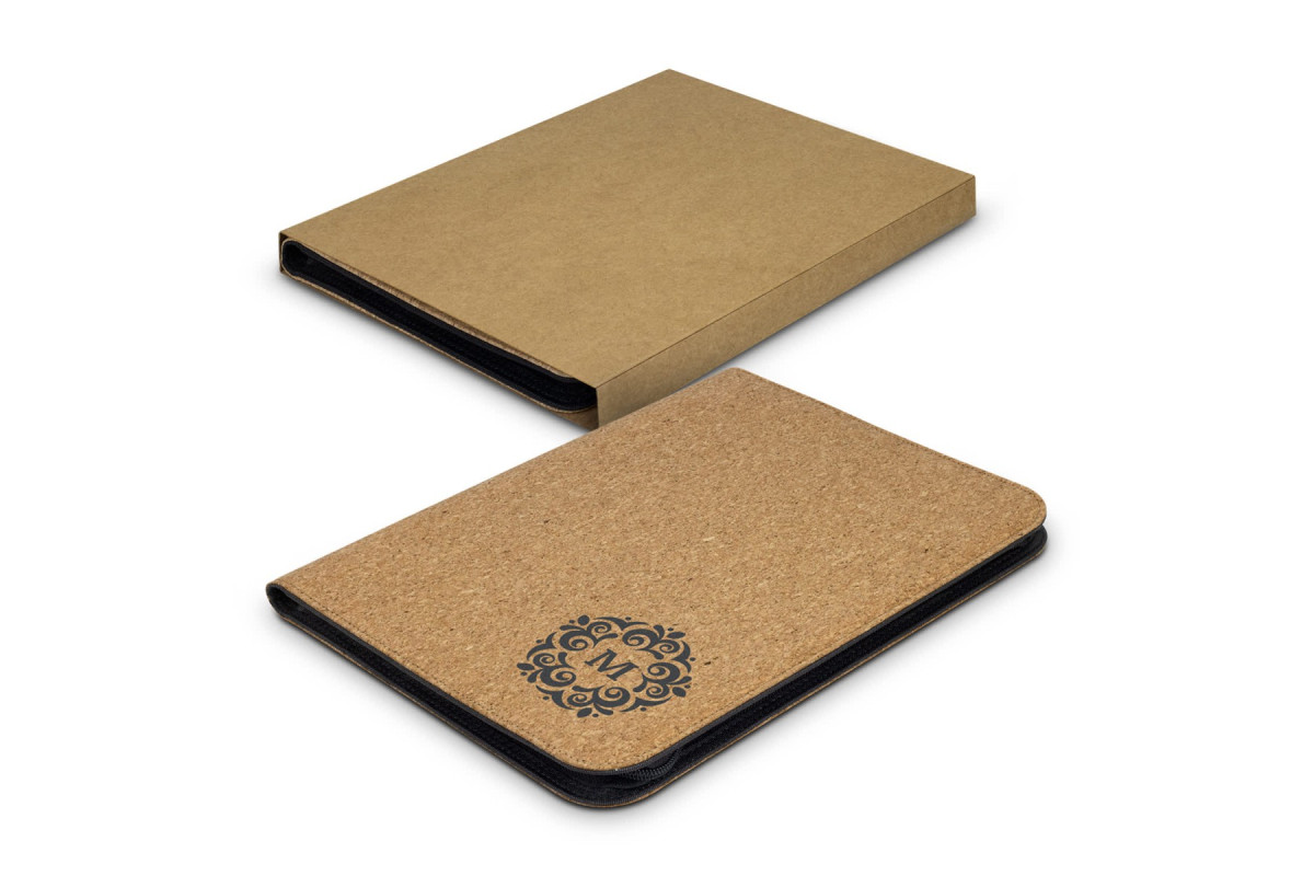Modern A4 Portfolio, manufactured from cork with a zippered closure. Other features include a lined paper pad, a pen holder, six business card slots, a pocket for notes, and a large slip-side pocket for documents. When the cork is harvested only the outer bark is removed from the tree. This allows the tree to continue growing and replenishing the bark. It also has the benefit of a comfortable soft-touch texture while being very durable. The portfolio is presented in an unbleached kraft cardboard sleeve. Features: * Modern portfolio manufactured from cork * Includes lined paper pad, a pen holder, business card slots, a pocket for notes and a slip side pocket for documents