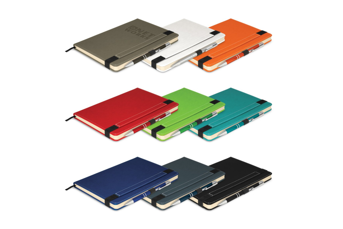 Superb medium-size (approximately A5) notebook with 80 leaves(160 pages) of 80gsm lined cream paper and a hard cover with an antique PU finish. It has a bookmark ribbon and an elastic closure band with a unique branding strip. Premier has a cardboard storage envelope on the inside back cover, and the front cover thermo debosses to a stunning two-tone finish. Each notebook has its own stylish aluminium pen neatly included in the elastic pen loop. The pen and notebook are matched as close as the materials allow.