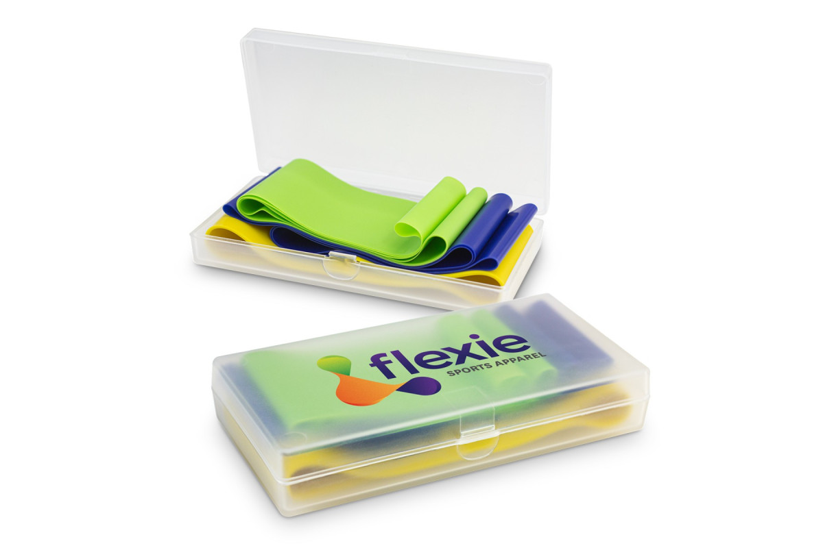 Set of three silicone exercise bands presented in their own carry case. Each band has a different resistance level to produce a range of workout intensities. Branding is on the case.