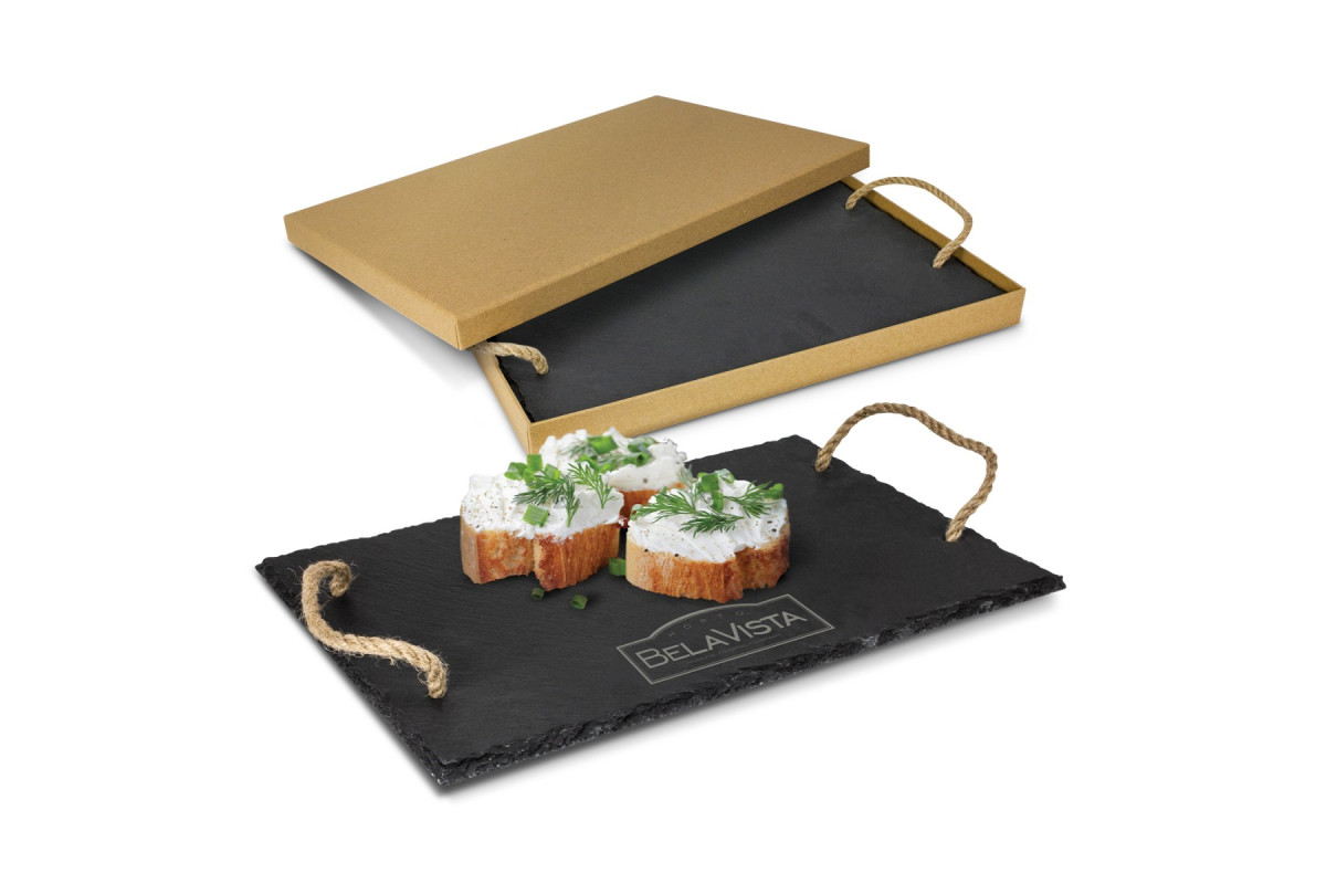 Deluxe natural slate serving board with four soft non-slip and non-marking polyurethane pads on the base. It has natural hemp rope handles and is beautifully presented in an unbleached cardboard gift box.