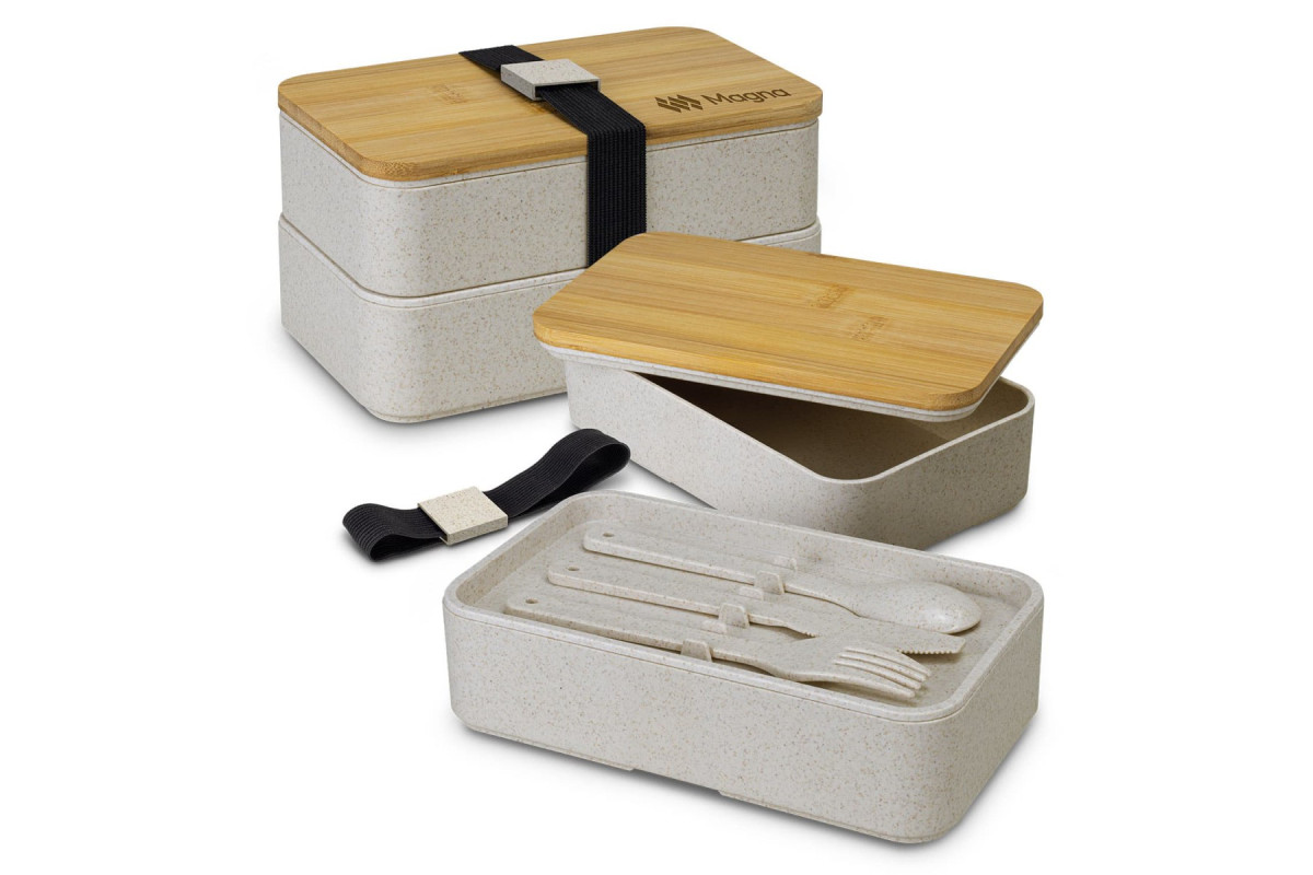 Eco-inspired 1000ml stackable lunch box which is manufactured from a unique 50/50 blend of natural wheat straw fibre and BPA-free polypropylene. This lunch box includes a set of utensils with a separator and has a bamboo push on lid that is held securely in place with an elastic band. Bamboo is a natural material which produces unavoidable variances in the grain pattern, colour and branding.