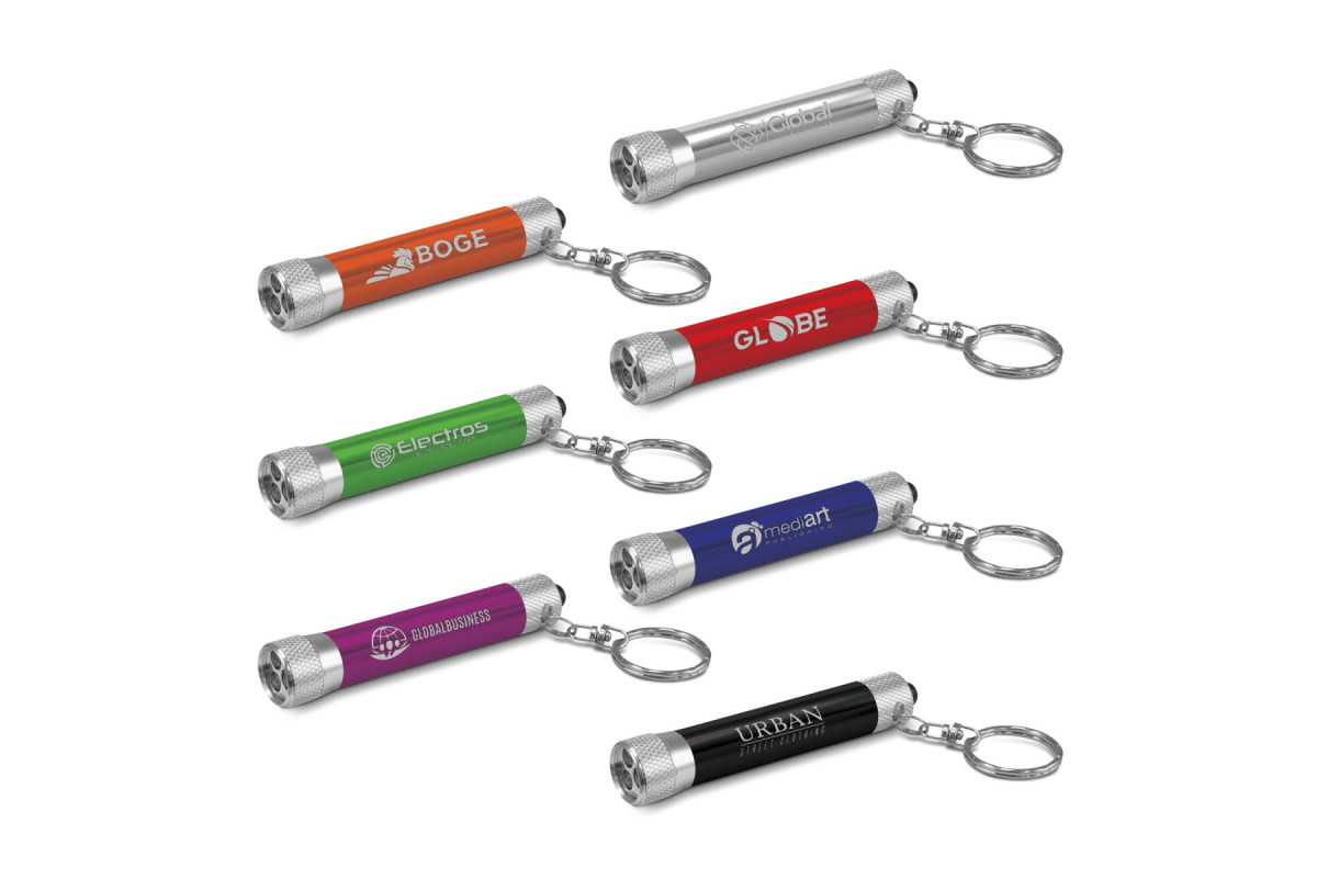 Aluminium mini torch with a handy key ring and three powerful LEDs which produce bright white light. It uses one AAA battery which is included and it laser engraves to an oxidised white colour.